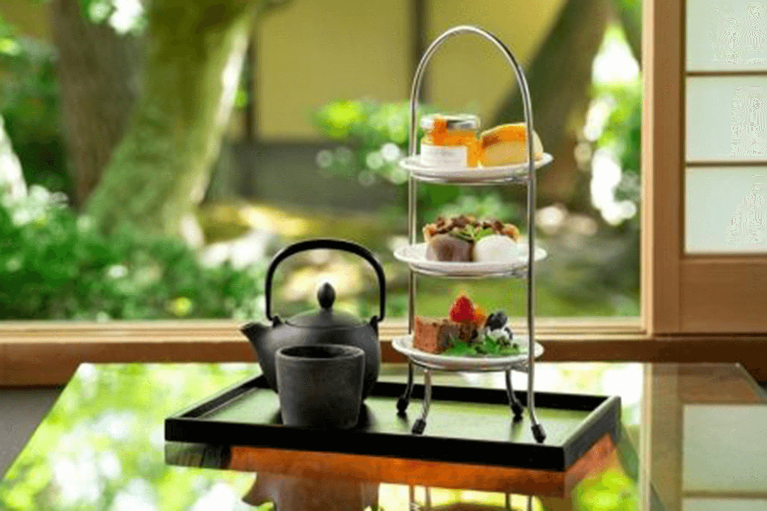 甘味とお食事を嵐山の美景と共にお楽しみいただけるアフタヌーンティーセットです。江戸中期創業の御菓子司「鍵善良房」とのコラボレーションアフタヌーンティーを、ホテル内カフェ「茶寮 八翠」にてお届けいたします。