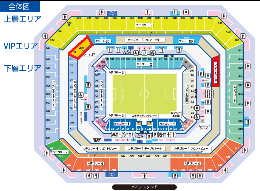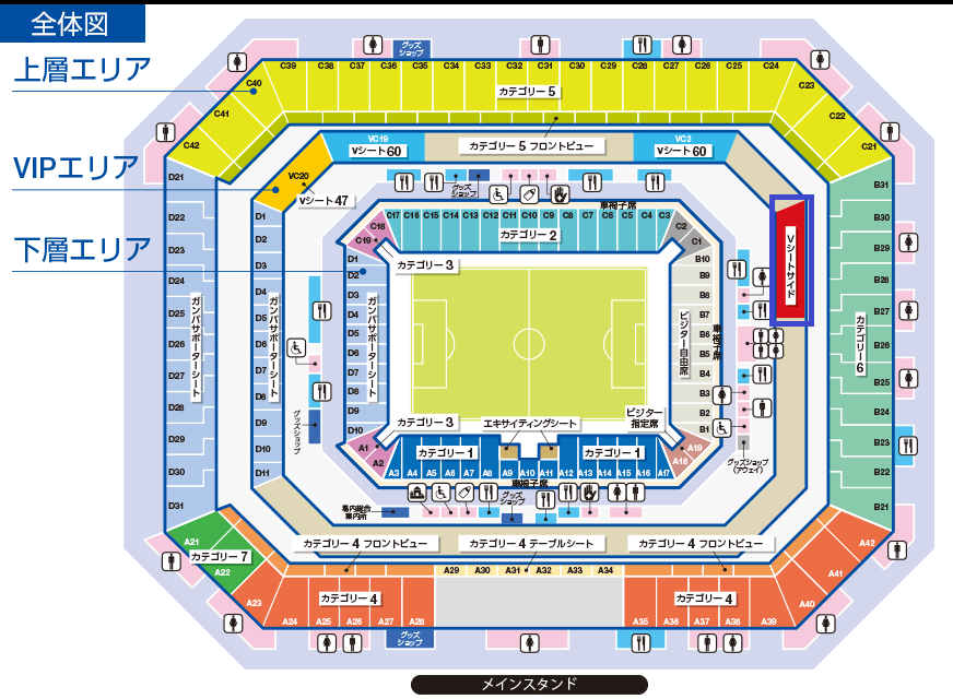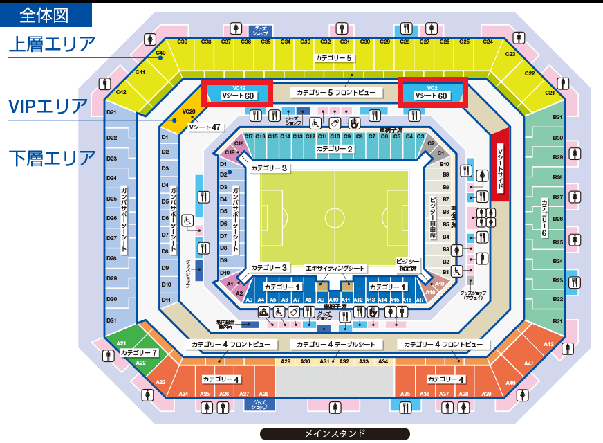 Vシート60は上の全体図の赤枠で囲った場所にあります。スタンドの上層エリアと下層エリアの間、つまり中層に位置しています。