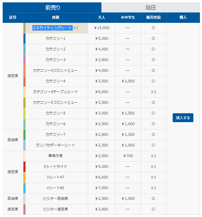 エキサイティングシートやカテゴリー〇については公式ホームページに案内が写真とともに出ています