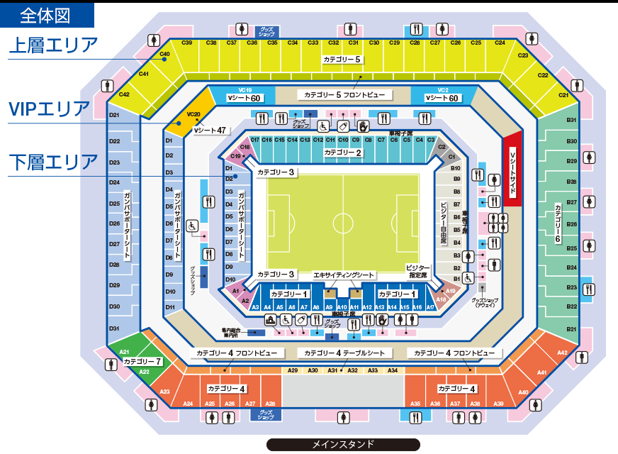 パナソニックスタジアム吹田のVシート60は座席が快適(クッションあり、座席幅広い)だけでなくVIPルームを使うことができ、気温が高かったり低かったり、雨風が強い時など気候が厳しい時にも快適に観戦でき、ハーフタイムでもトイレに並ばなくていいなどメリットが大きい座席です。値段は高いですが子供連れの方などにはオススメの座席です!