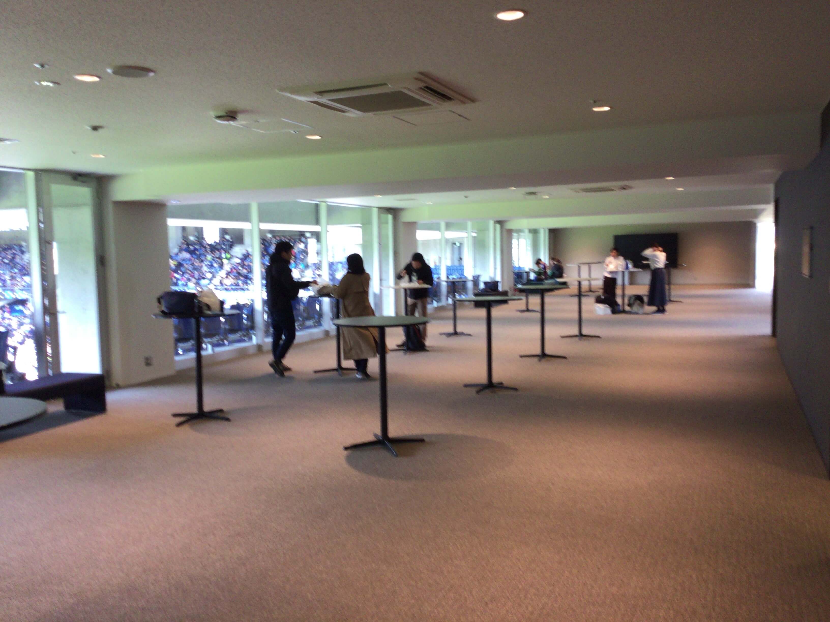 VIPルームは上の写真のような部屋で立ったままにはなりますがテーブルが用意されており飲食も可能ですし、数は少ないですが窓側にソファーもあります。空調完備なので暑い時期、寒い時期、そして風雨が強い時などはこちらに入れば快適に休むことができますし、最悪外で見るのが辛いコンデションであれば窓側で立って試合を見ることもできます。