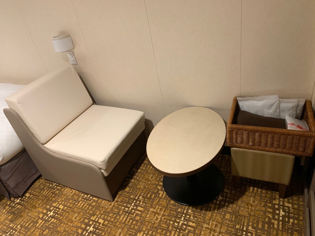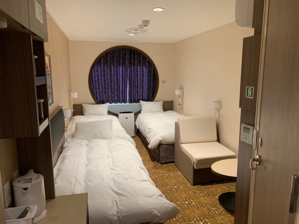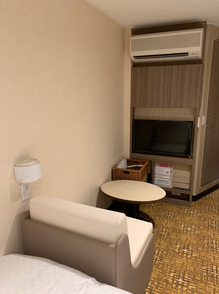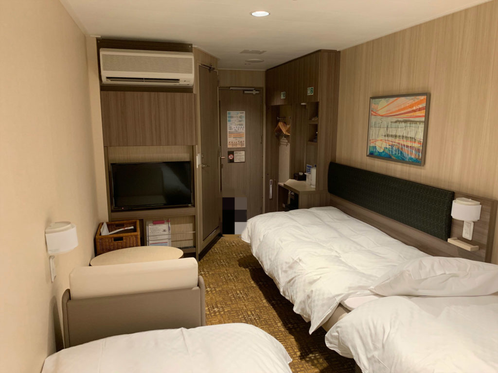 14.10㎡の客室にはツインベッド、ソファベッド、テレビ、空気清浄機、小さなテーブル、ソファが備えられておりちょっとしたビジネスホテルのようです(スイートは23㎡でシティホテルのようでした)。