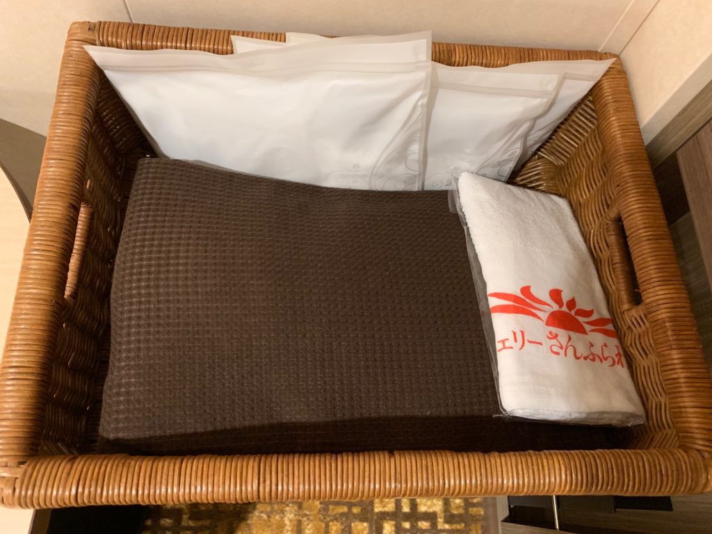 パジャマと持ち帰りOKのフェイスタオル、アメニティはカゴに入れられています。