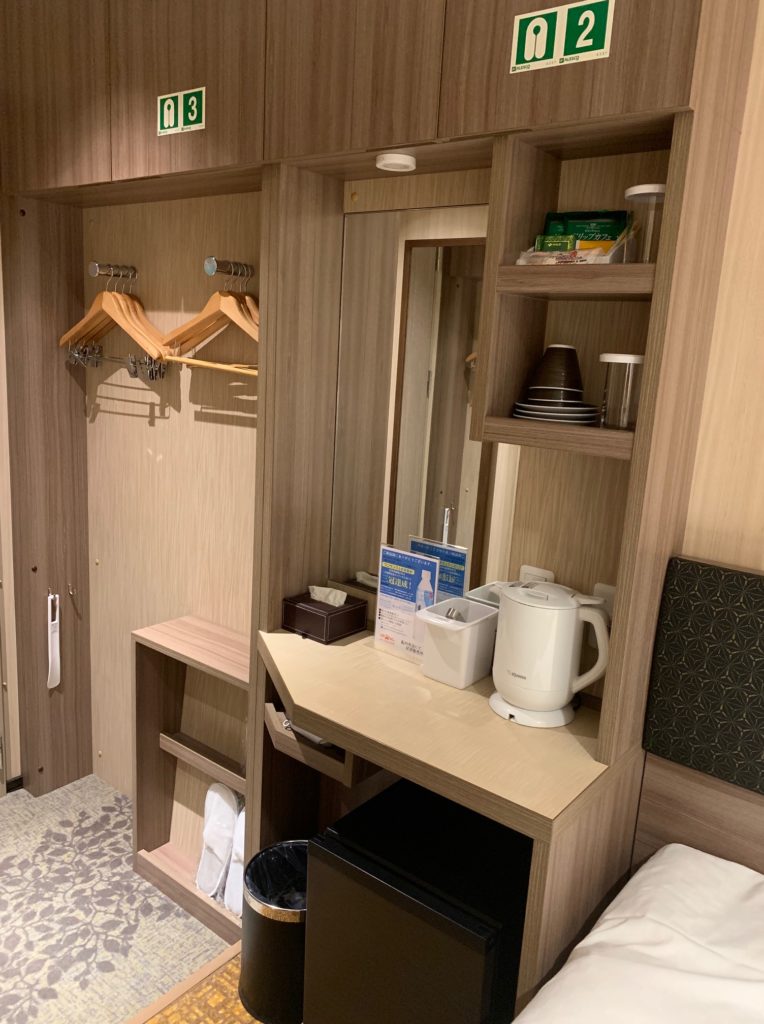 入り口入ると右手に衣服をかけるスペースと電気ケトル、アイスペール、ティッシュが置かれたテーブルがあります。その下には冷蔵庫があります。