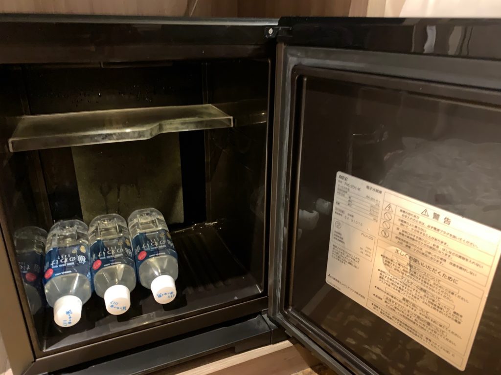 冷蔵庫は基本的に空ですが、「樵のわけ前」という天然水のペットボトルが入っています。こちらの水は売店で他の水より高い170円で販売されていました。