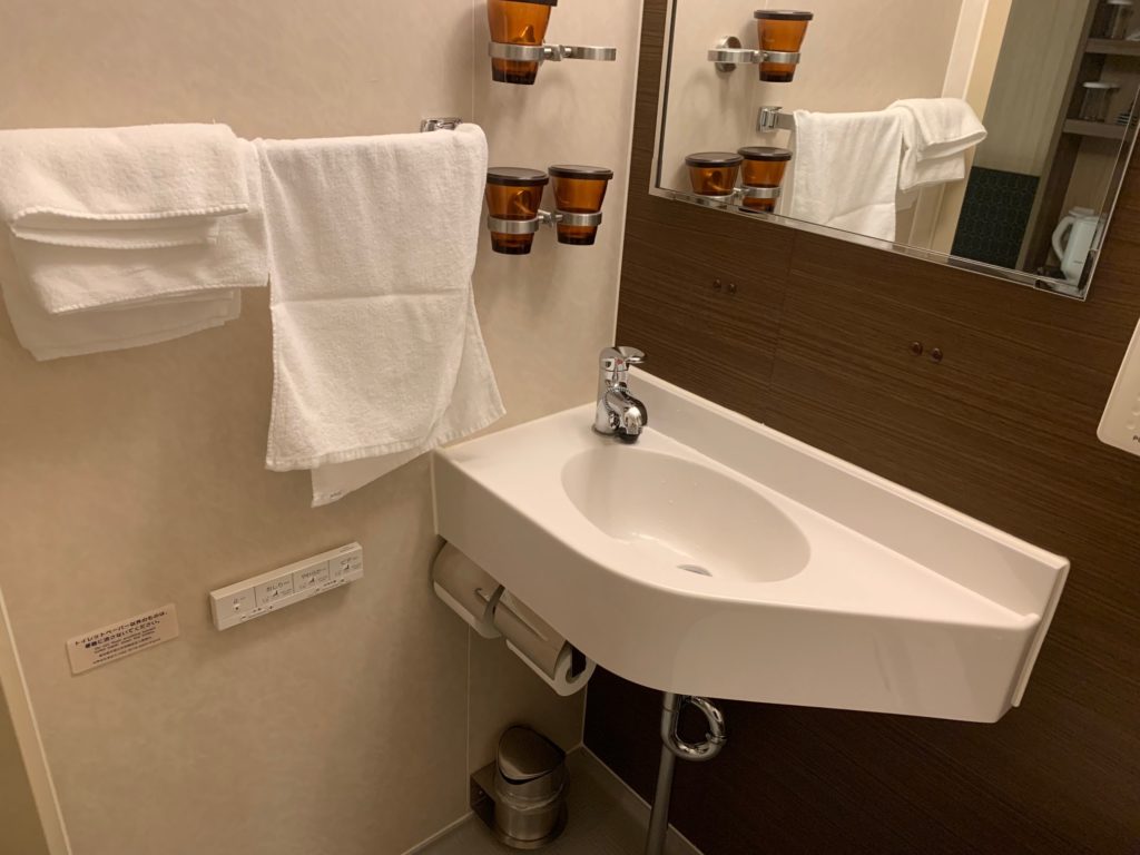 洗面台はこんな感じです。スペースが狭くコップはラックにかけられています。トイレはウォシュレットです。