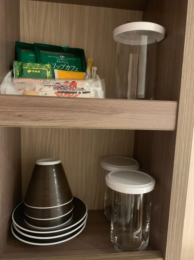 上の棚にはコップなどの他にお茶 ・コーヒー・紅茶 ・さんふらわあビスケットがありました。