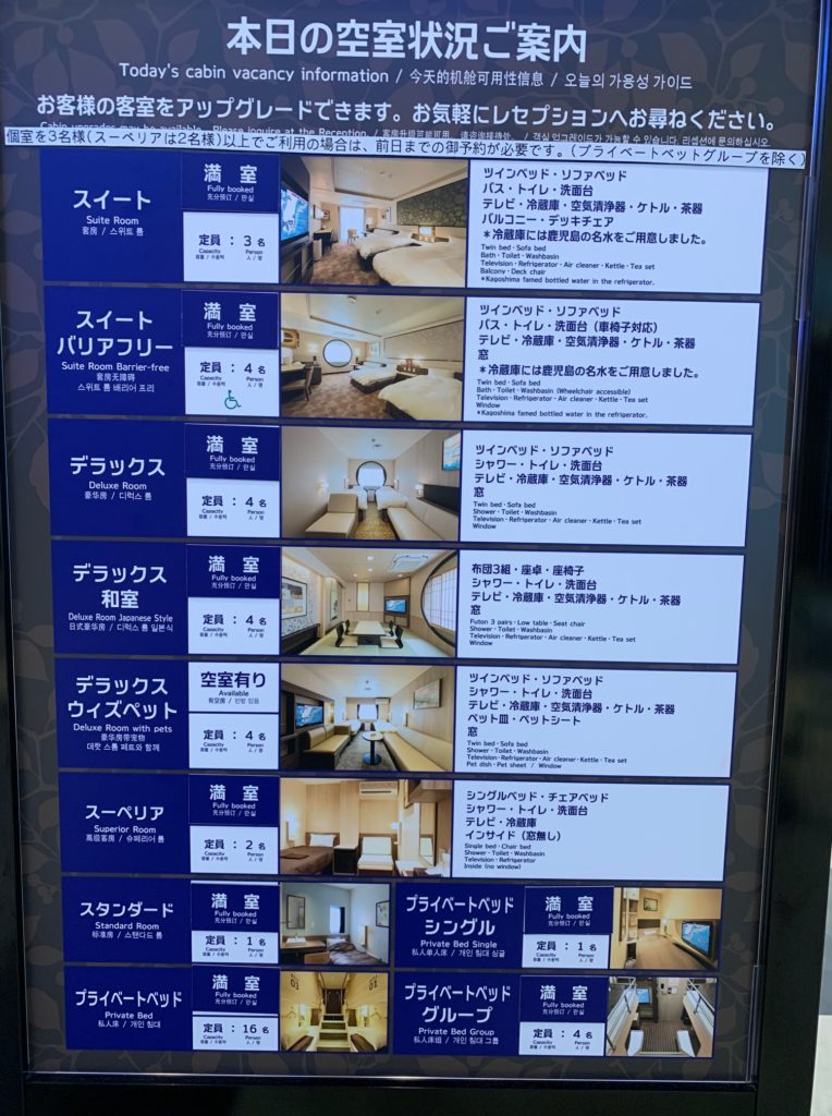一般客室は全5グレードあります。この日はデラックスウィズペット以外は満室で新船の人気のほどがうかがわれます。