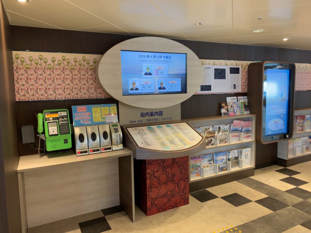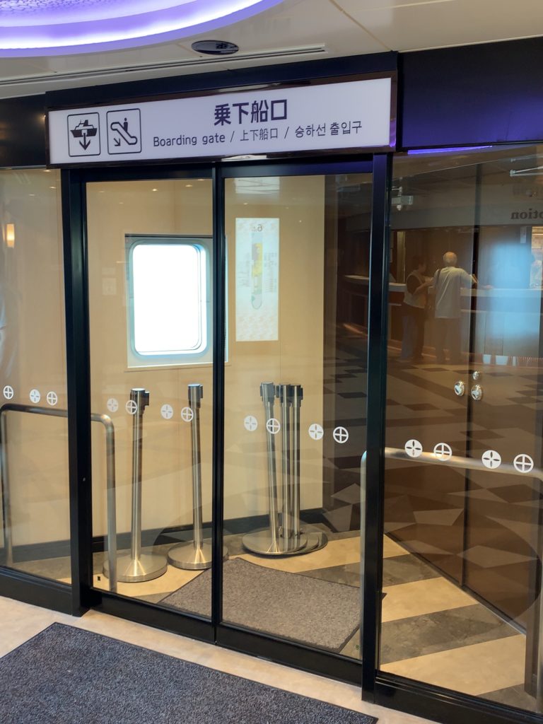 乗下船口から船に入るとまずはエントランスホールに着き、レセプションがあります