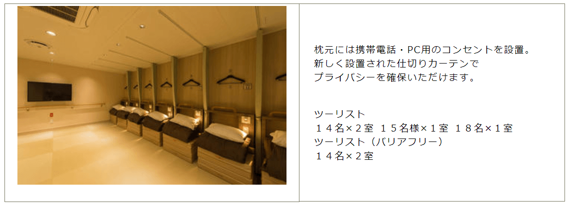 最も安い大部屋「ツーリスト」も、ひとりひとりのスペースに仕切りカーテン、電源コンセントが設けられており、従来の「雑魚寝」のイメージはもうありません。