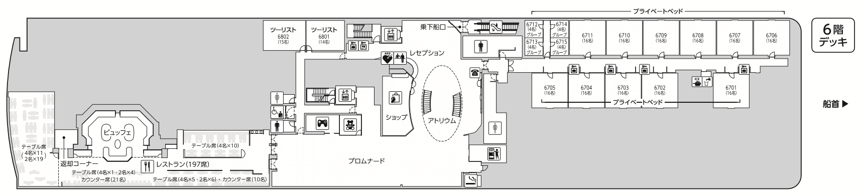 船の大きさの目安である総トン数は旧船の12415tから13500tにアップしました。全長192m 幅27mで旅客709名トラック121台乗用車134台を積むことができます。船の大きさが大きくなったのですが、旅客定員数は旧船の921名から709名へと減少しています。これは8割以上が個室タイプの客室となり、共用スペースも拡張されたためです。
