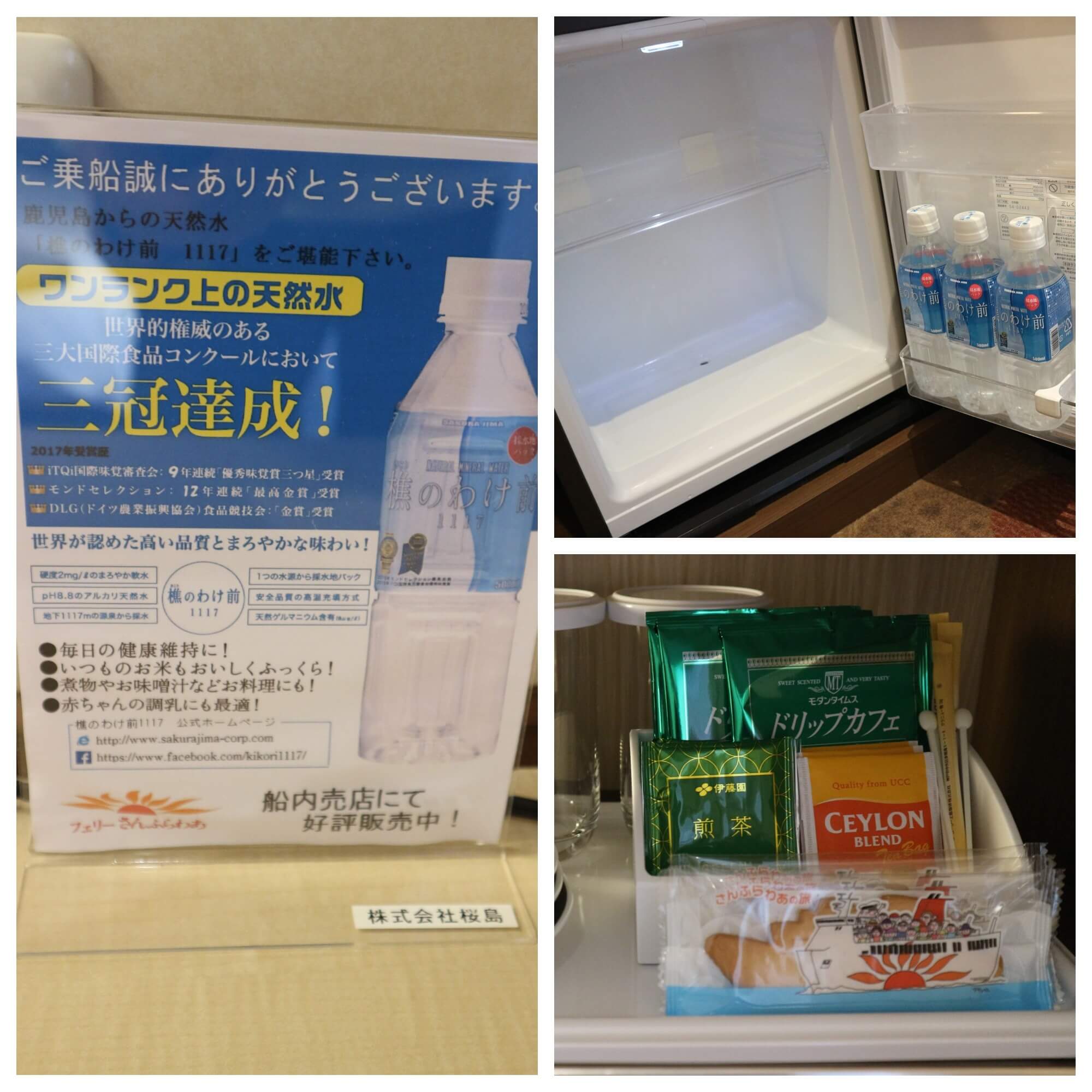 冷蔵庫は基本的に空ですが、「樵のわけ前」という天然水のペットボトルが入っています。こちらの水は売店で他の水より高い170円で販売されていました。テーブルの上の棚にはコップなどの他にお茶 ・コーヒー・紅茶 ・さんふらわあビスケットがありました。
