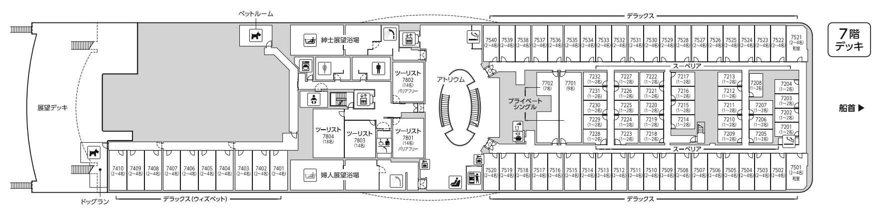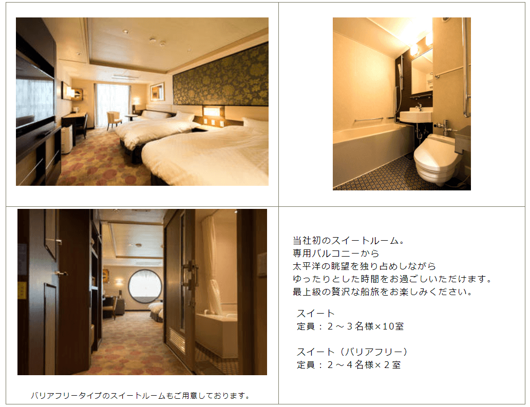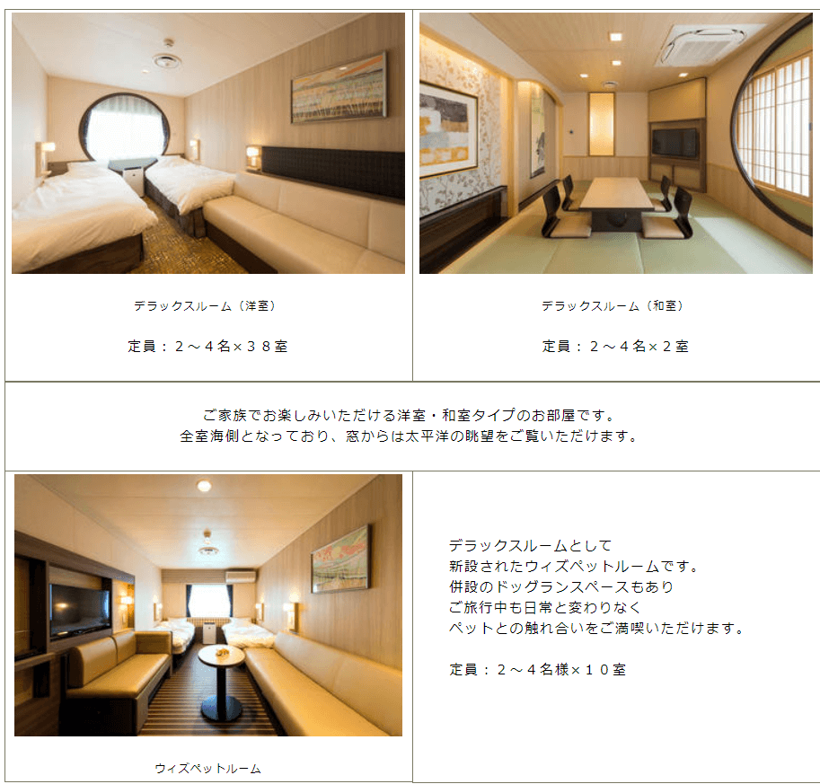 これまで最上級だった「デラックス」の部屋も増設され、計40室となっています。洋室38室だけでなく2室和室があります。ペットと一緒に過ごせるウィズペットルームも10室あり。船内ドッグランも併設されています。全室海側となっており、窓からは太平洋を眺めることができます。