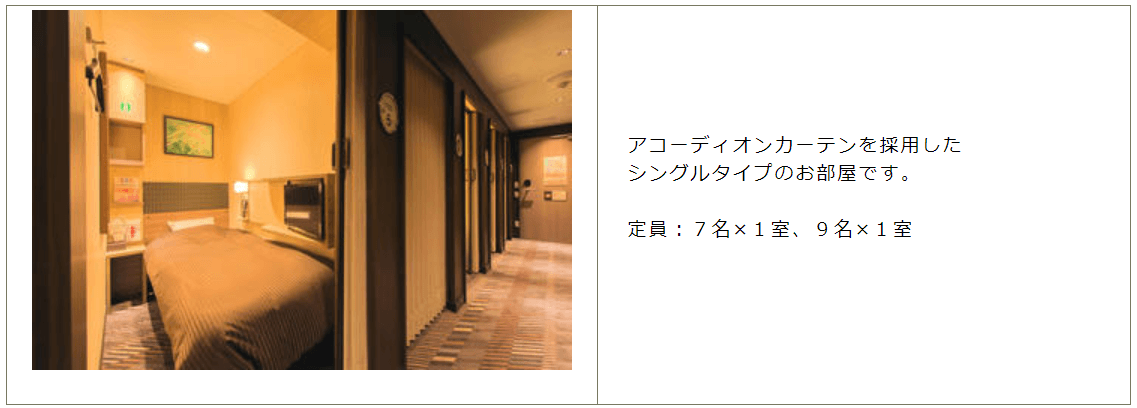 プライベートシングルは個室でアコーディオンカーテンで仕切られています。最近はやりのファーストキャビンというホテルのイメージです