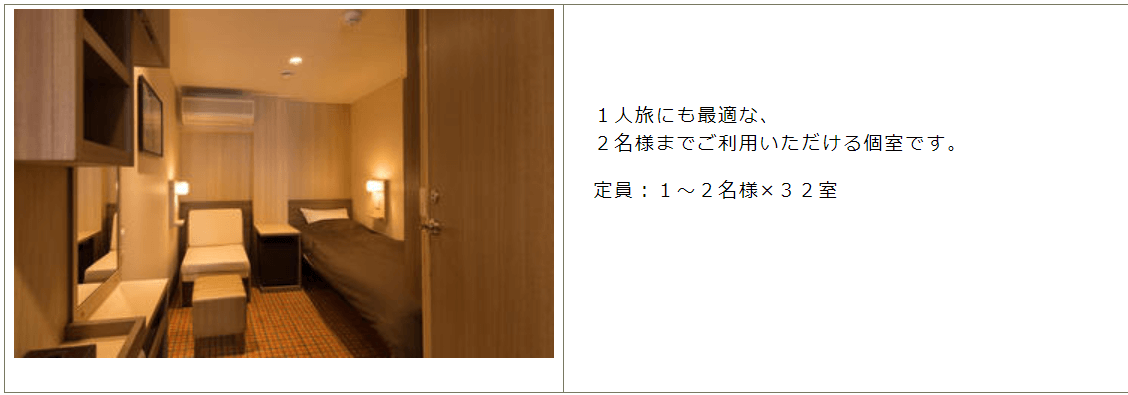 スーペリア(32室)は窓はないものの個室タイプでチェアベッドを使えば2名まで泊まることができます。