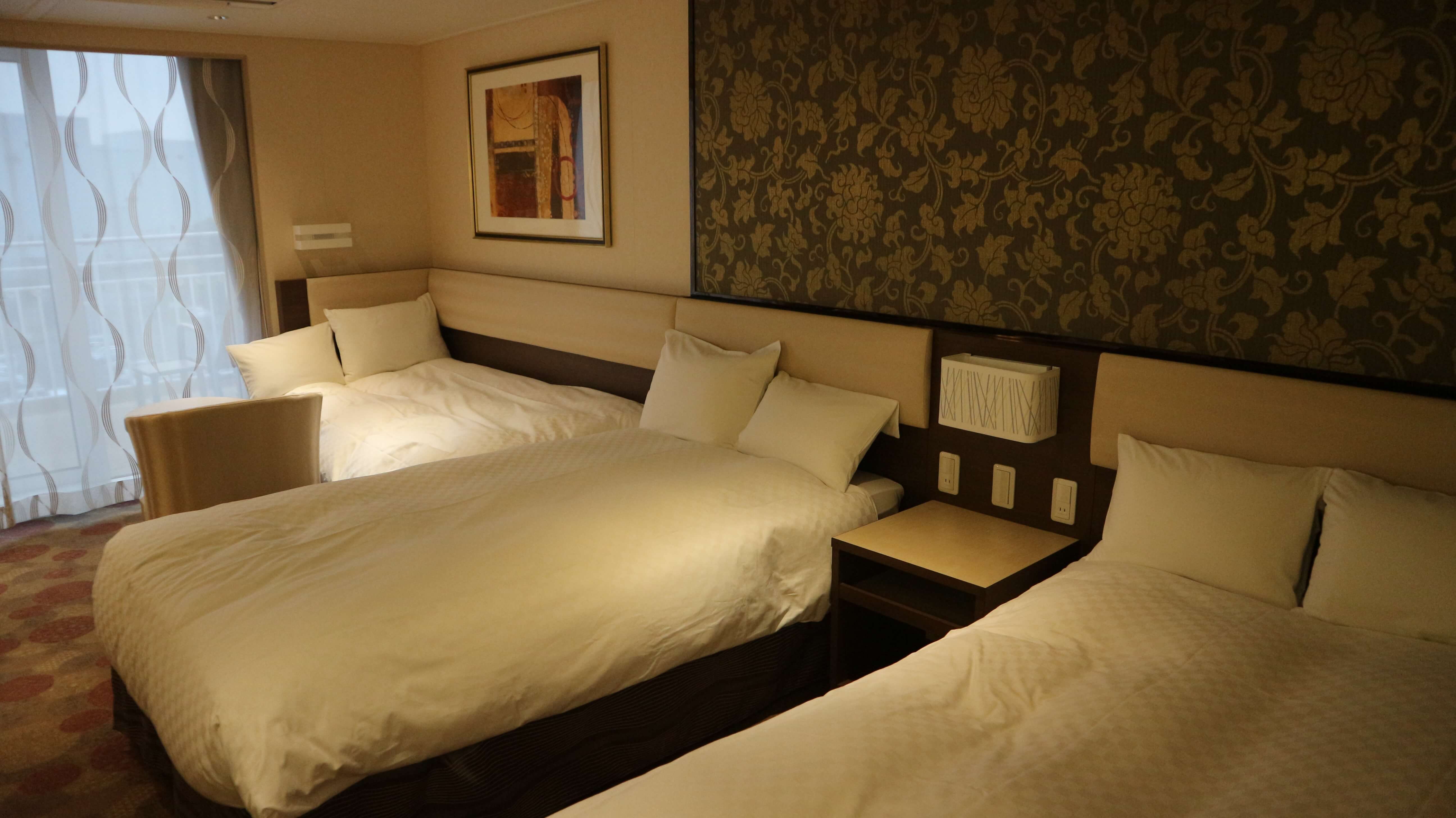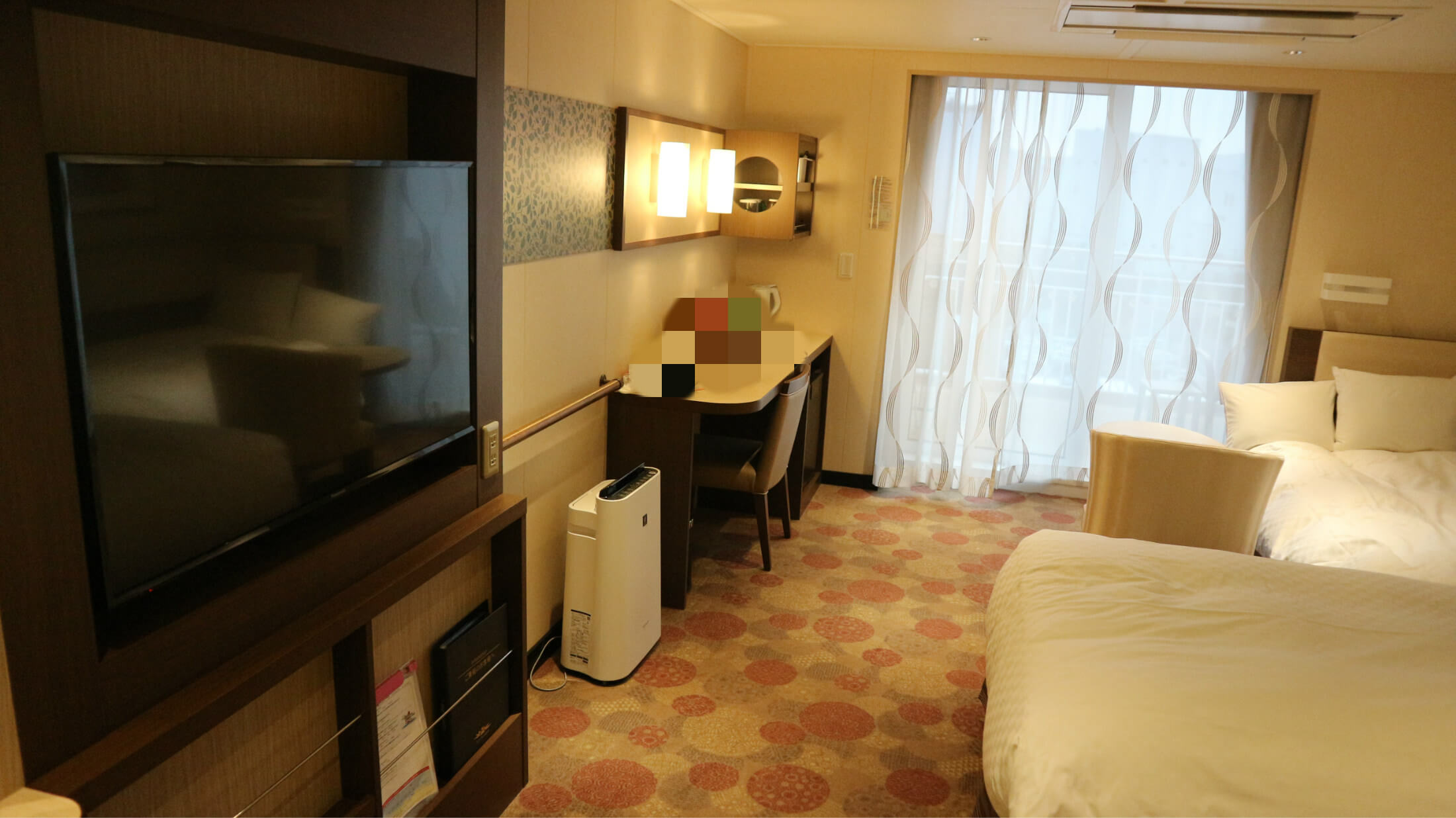 先ほど申しあげたように23平方メートル弱の客室にはツインベッド、ソファベッド、テレビ、空気清浄機、テーブル、椅子が備えられておりちょっとしたシティホテルのようです。