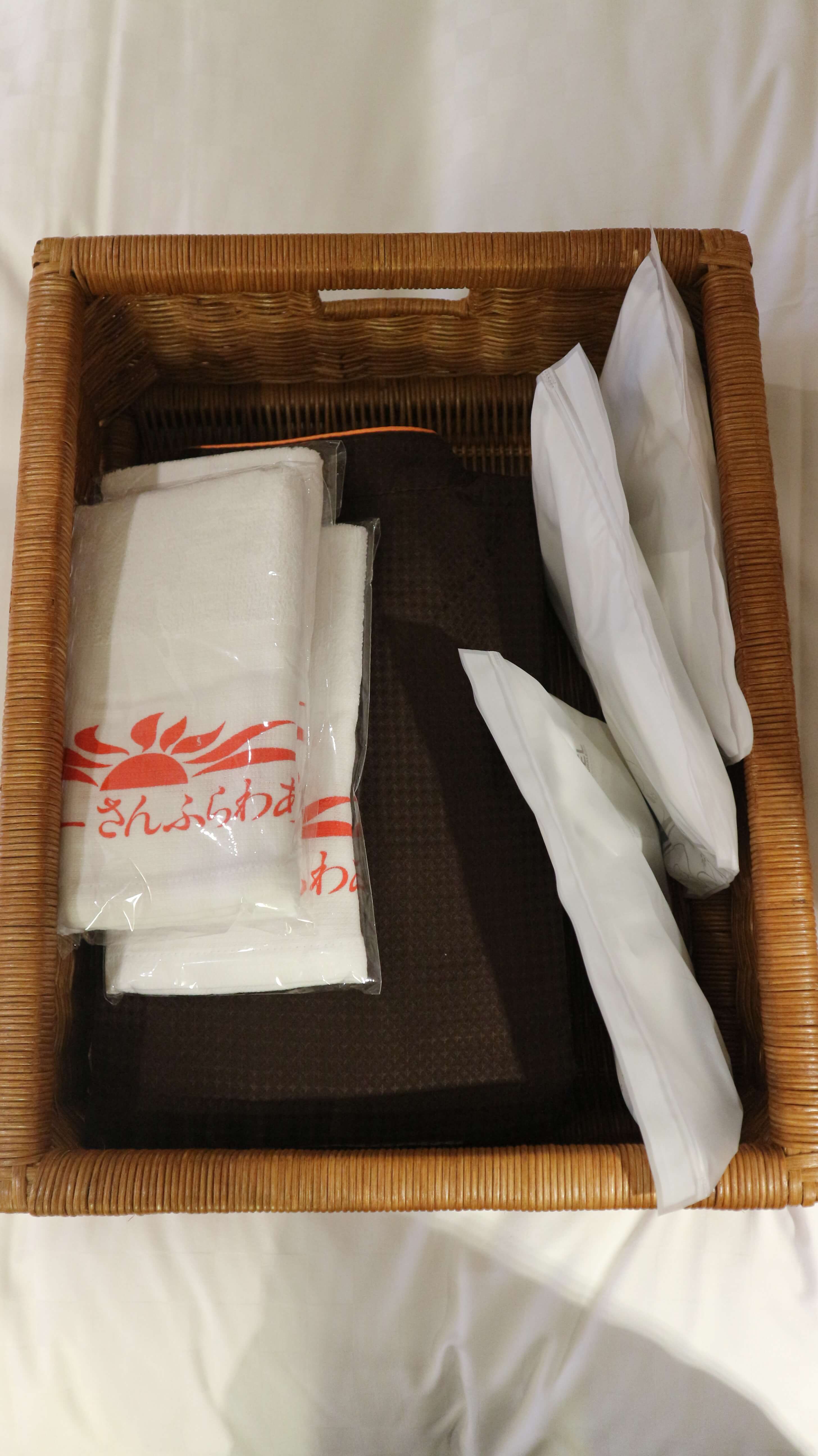 パジャマと持ち帰りOKのフェイスタオル、アメニティはカゴに入れられています。