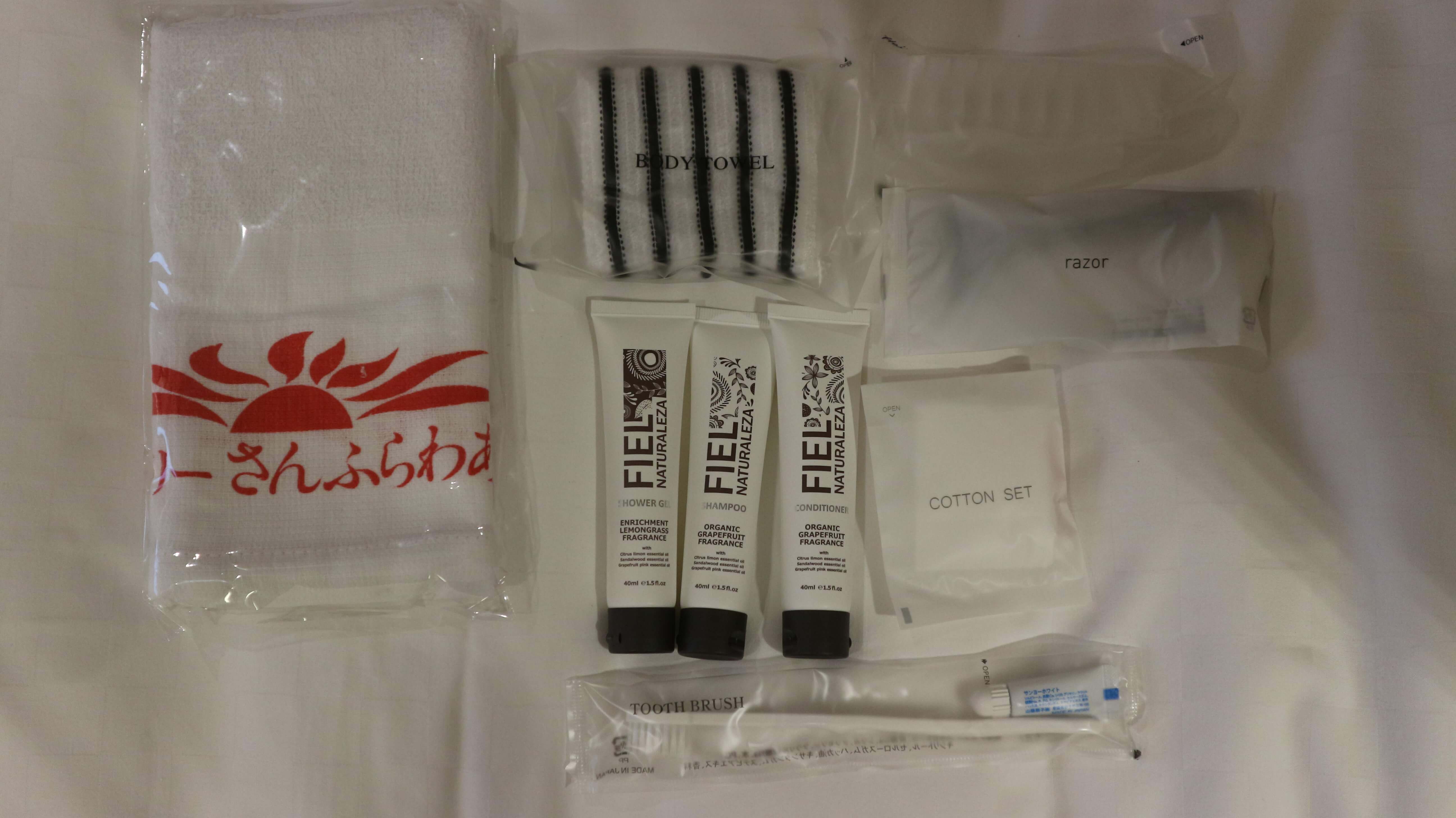 アメニティは以下の写真のような感じです。シャンプー・リンス・ ボディーソープ・ 歯ブラシ・タオル・カミソリ・ボディタオル・コットンセット・くしとこちらもちょっとしたシティホテルと変わりません。