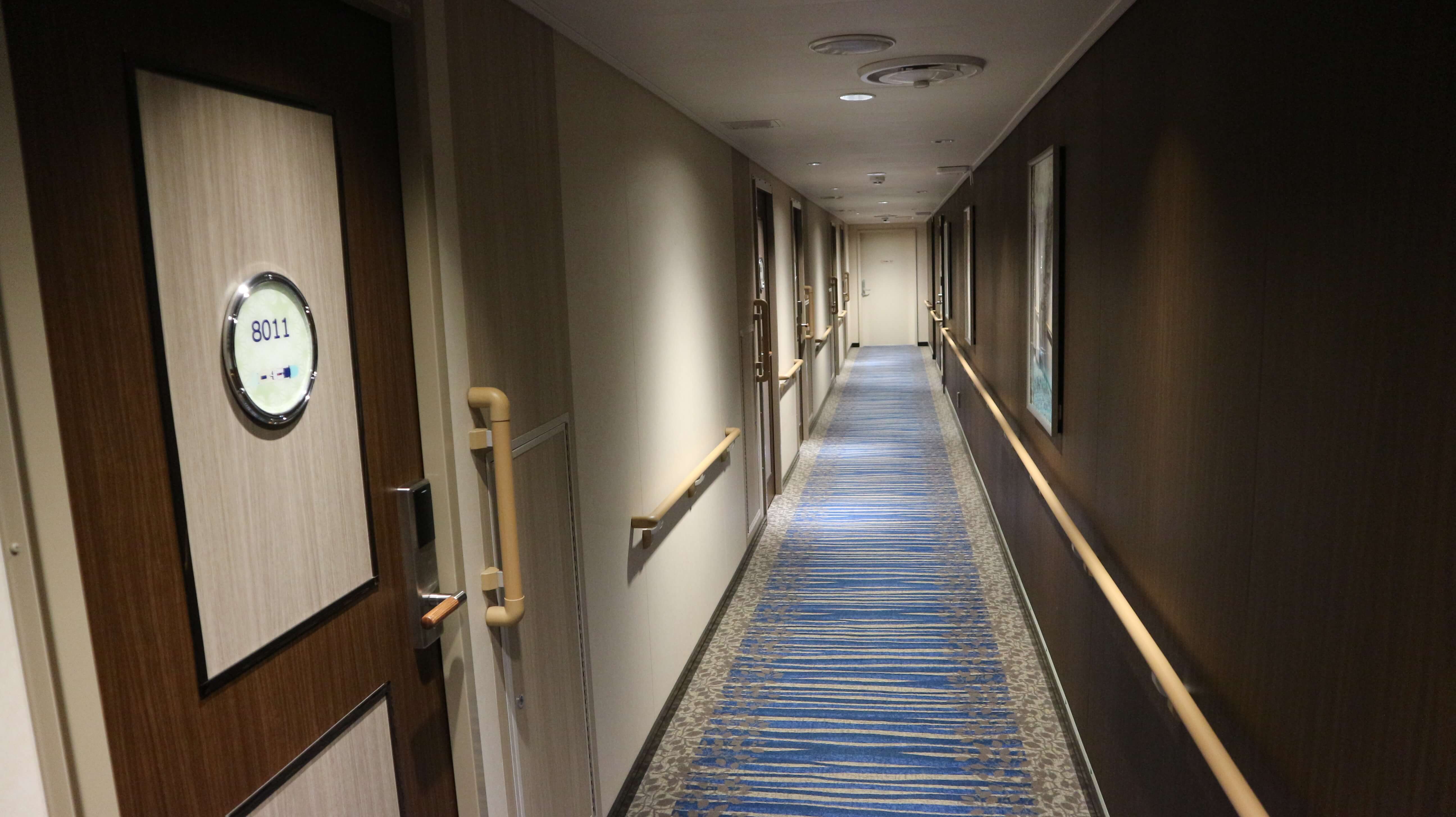 8階の客室の通路は下の写真のように落ち着いたインテリアに海を思わせる廊下のブルーの絨毯がキレイです。