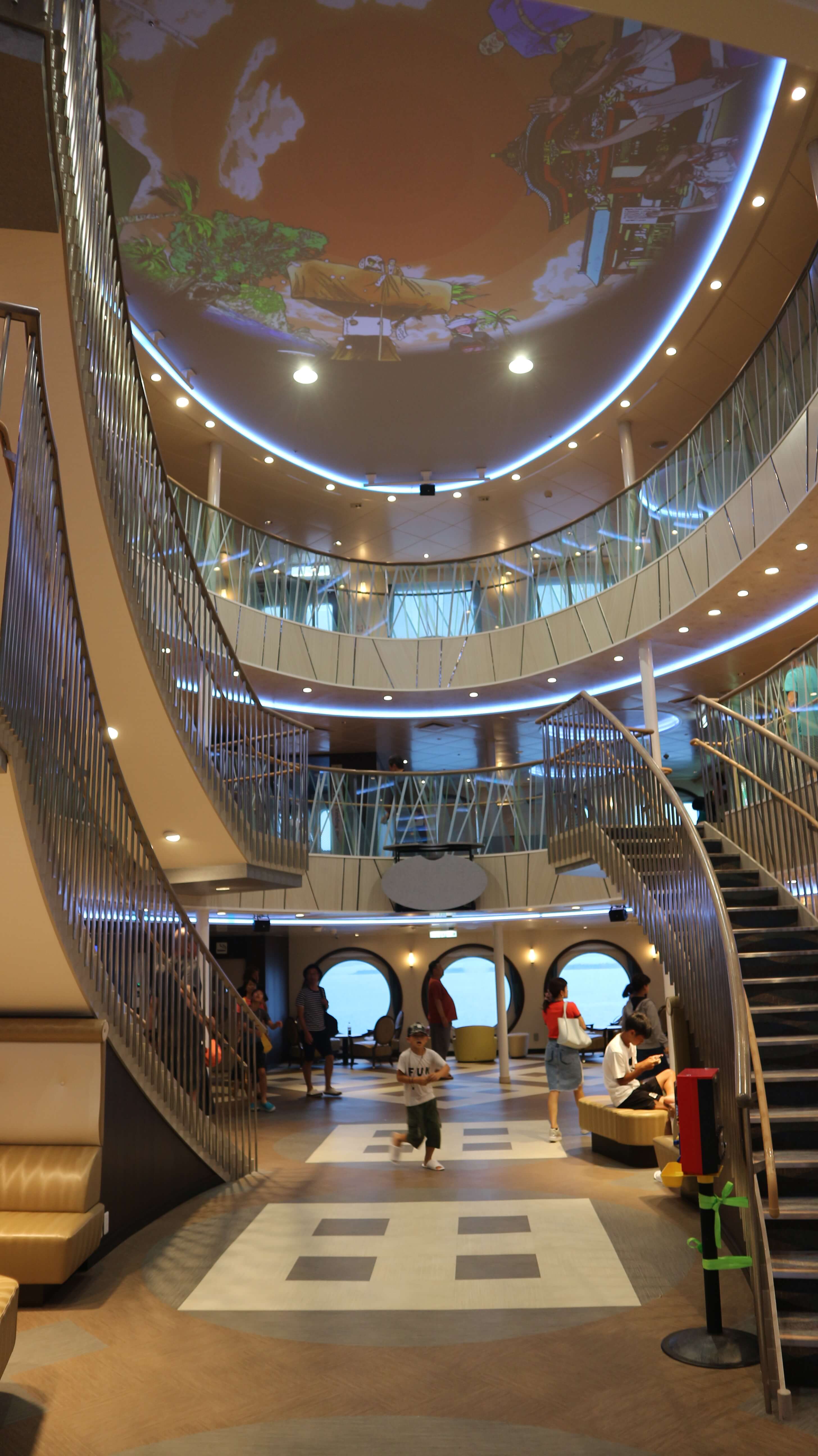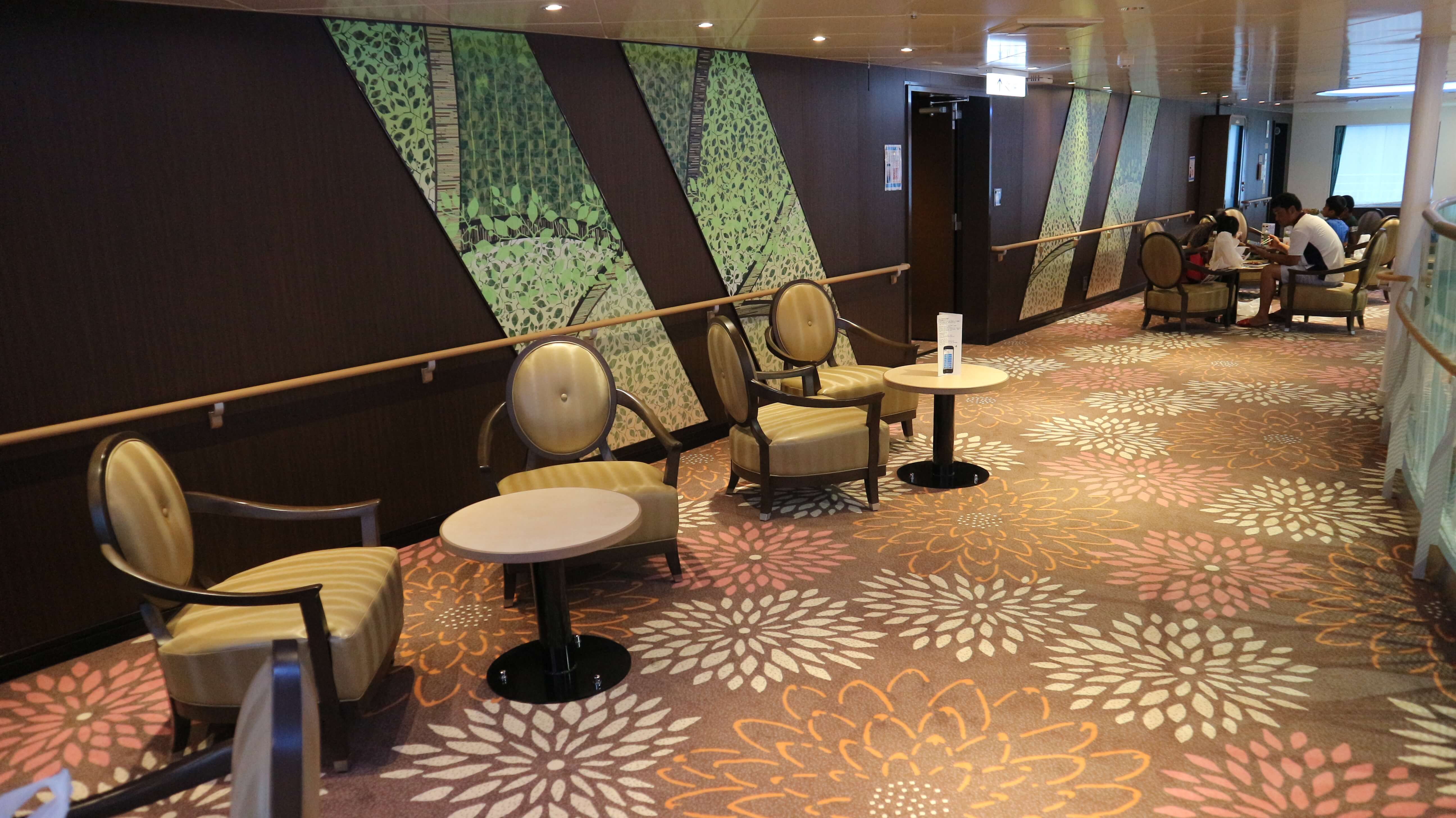 8階は客室も少なく人は少ないですが、8階を含めた各デッキ(三層)のアトリウムの周りにはくつろいで座れるイスが多く設けられており、本を読んだり、スマホを見たり、飲食をしたり、皆さん思い思いに過ごされておられました。
