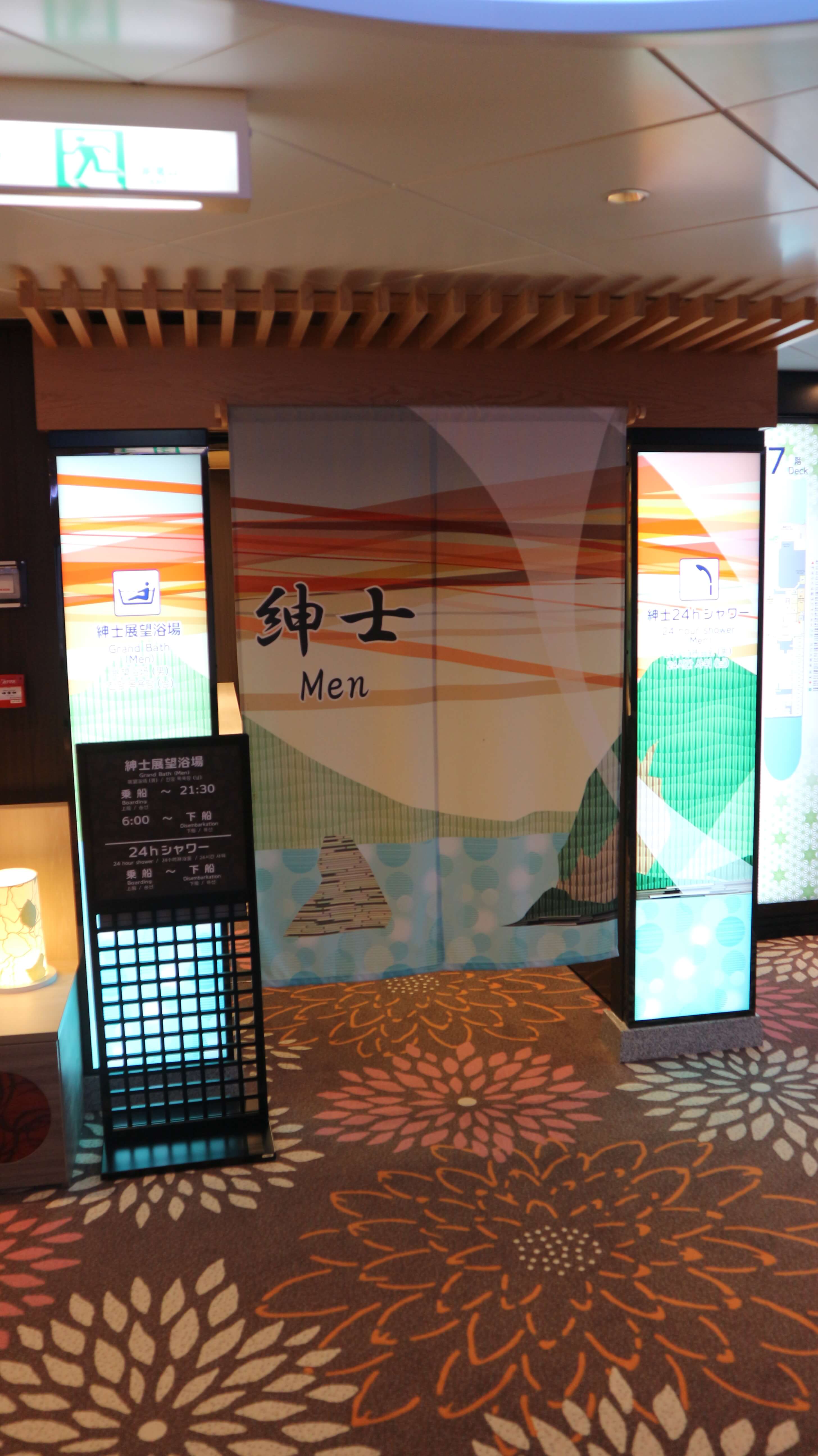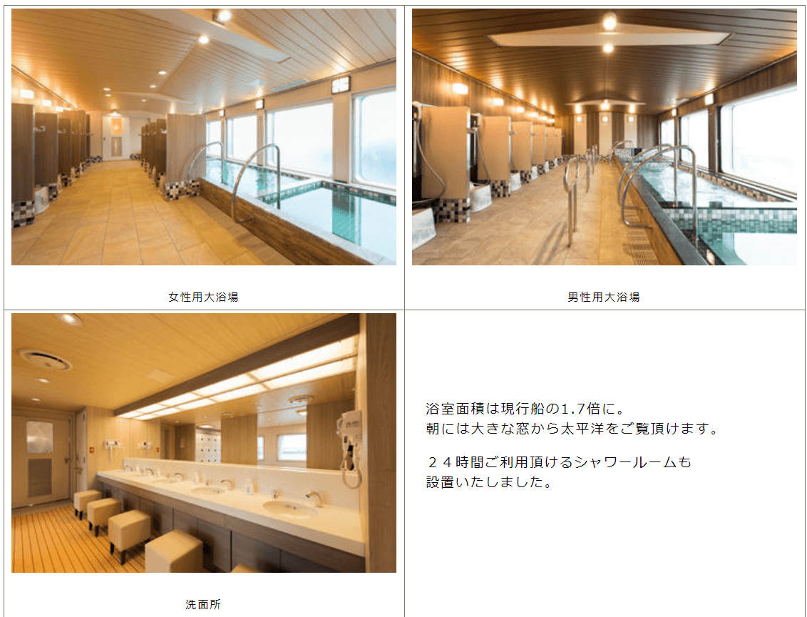 船内中央のパブリックスペースは旧船の2.5倍に、レストランは面積が旧船の1.5倍、座席数は20%増えて206席に、展望浴場も旧船の1.7倍の広さに拡張されています。