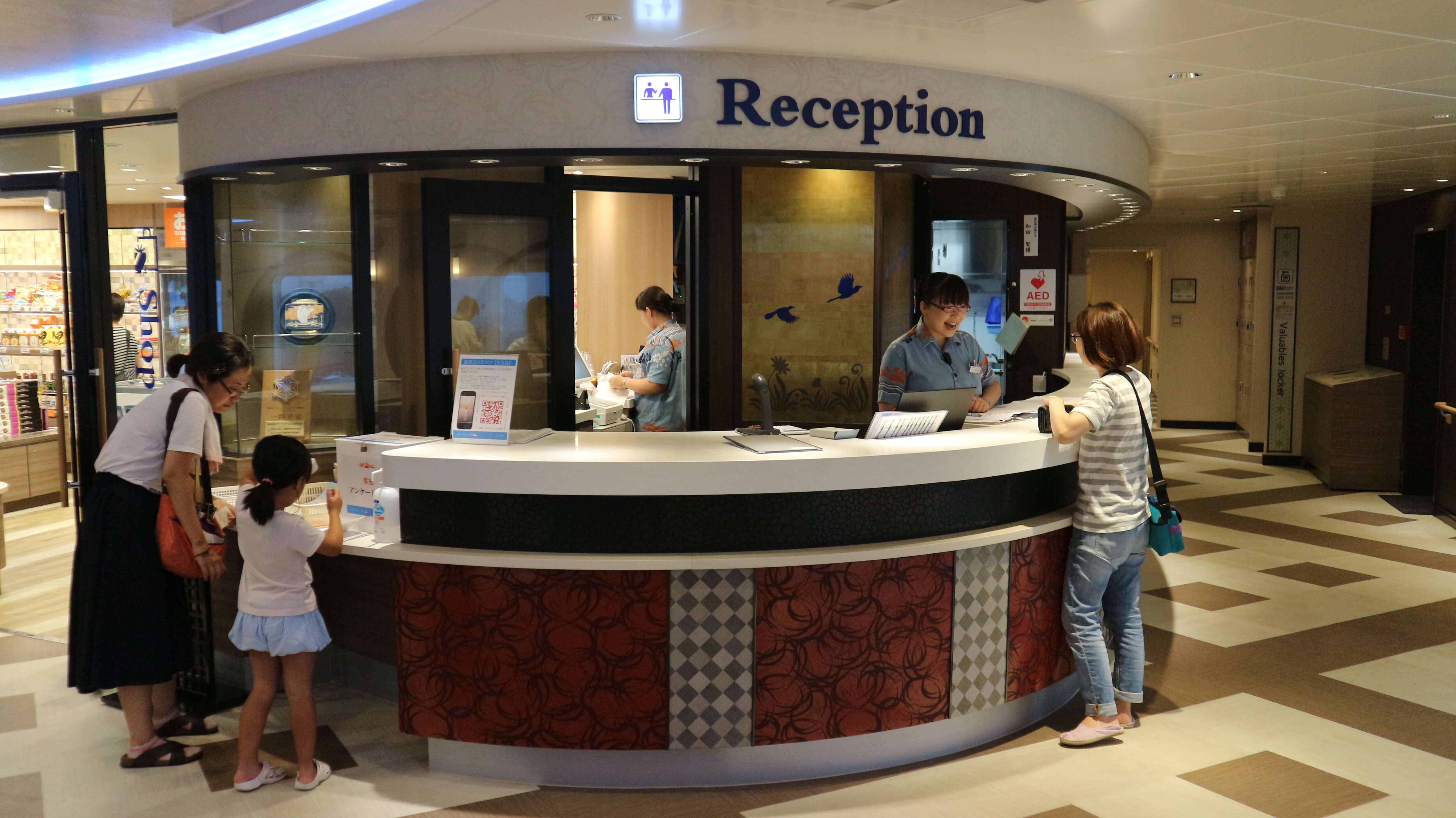 乗下船口から船に入るとまずはエントランスホールに着き、レセプションがあります