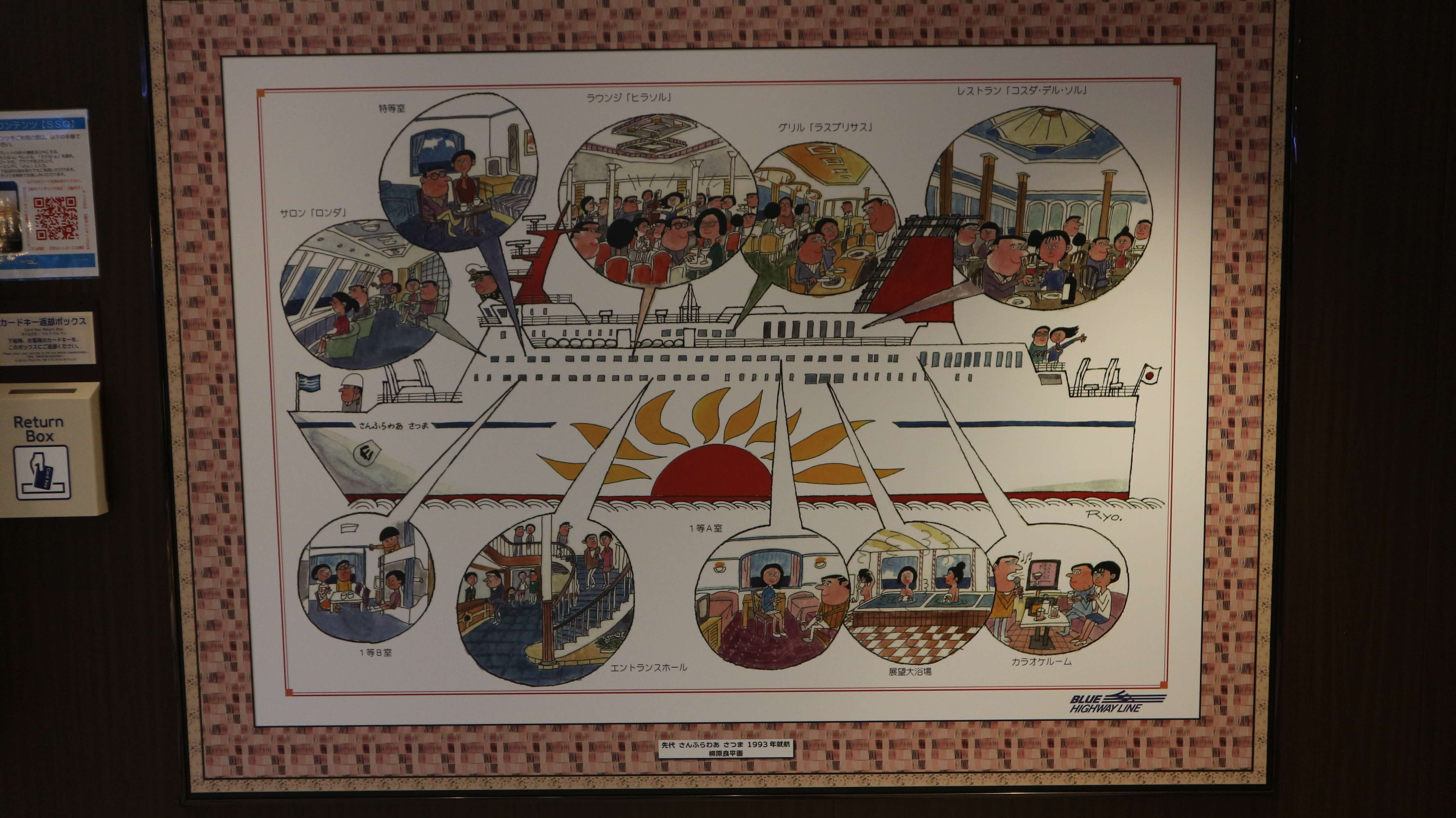 柳原良平画伯の描いた先代「さんふらわあ さつま」デビュー時のイラストもあります