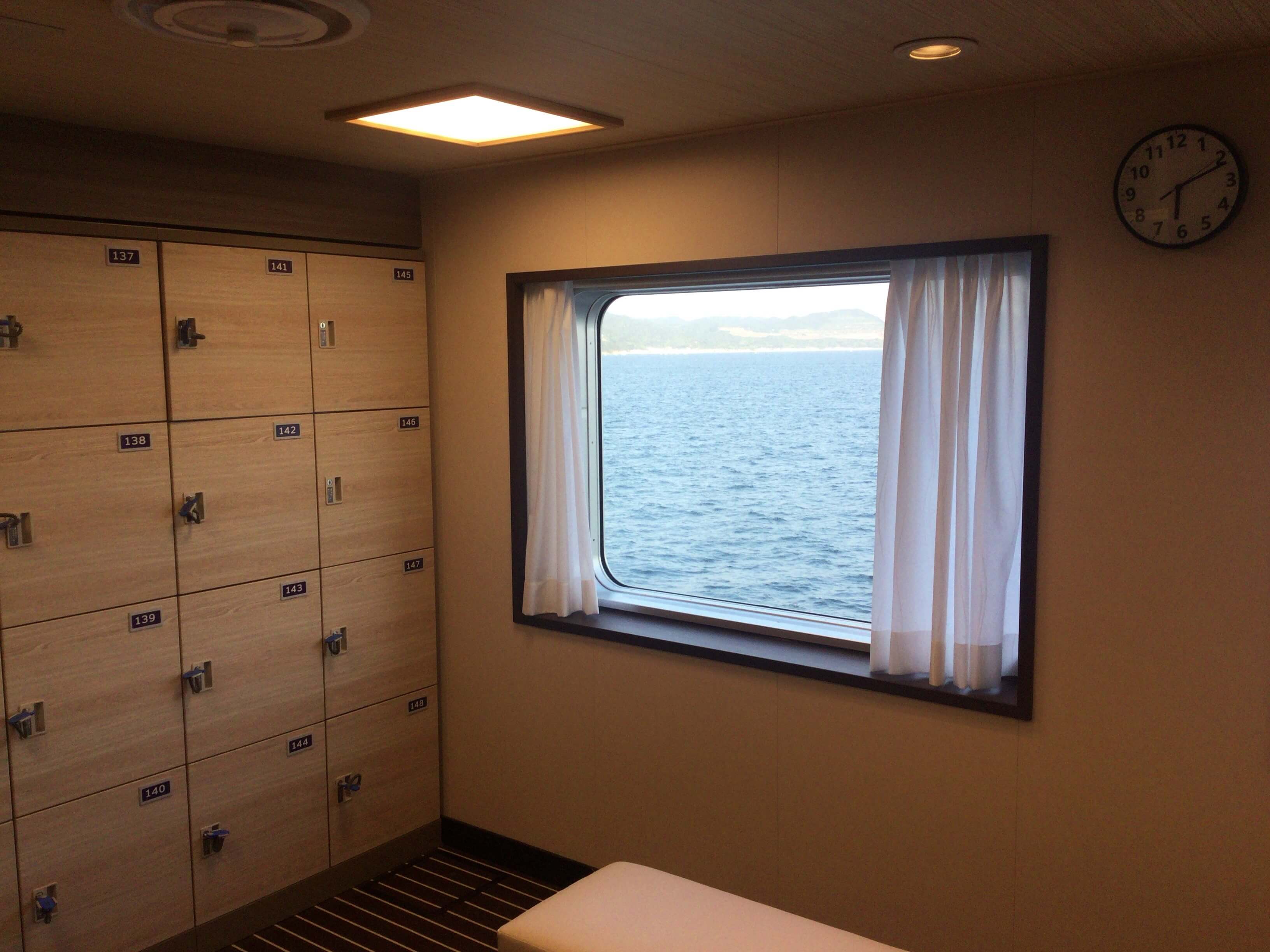 朝早くは脱衣所に人がいなかったので撮ってみました。このように海が見えます。以前の船は脱衣所が狭かったのですが広くなっていい感じです。