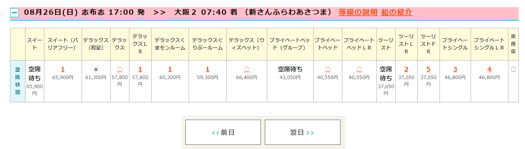 となっています。志布志⇔大阪間は以前から乗ってみたいと思っていたのですが船が古いので九州⇔関西間でフェリーを利用する時は大分⇔神戸航路を好んで使っていました。やはり同じような値段を払うなら新しくて快適な方がいいですからね(笑)