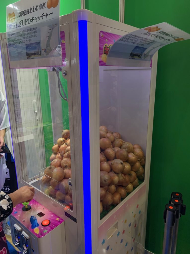 KNT-CT(近畿日本ツーリスト、クラブツーリズム)のブースで目立つのは南あわじ市産「玉ねぎ」のUFOキャッチャー(笑)取れなくても1個は貰えます