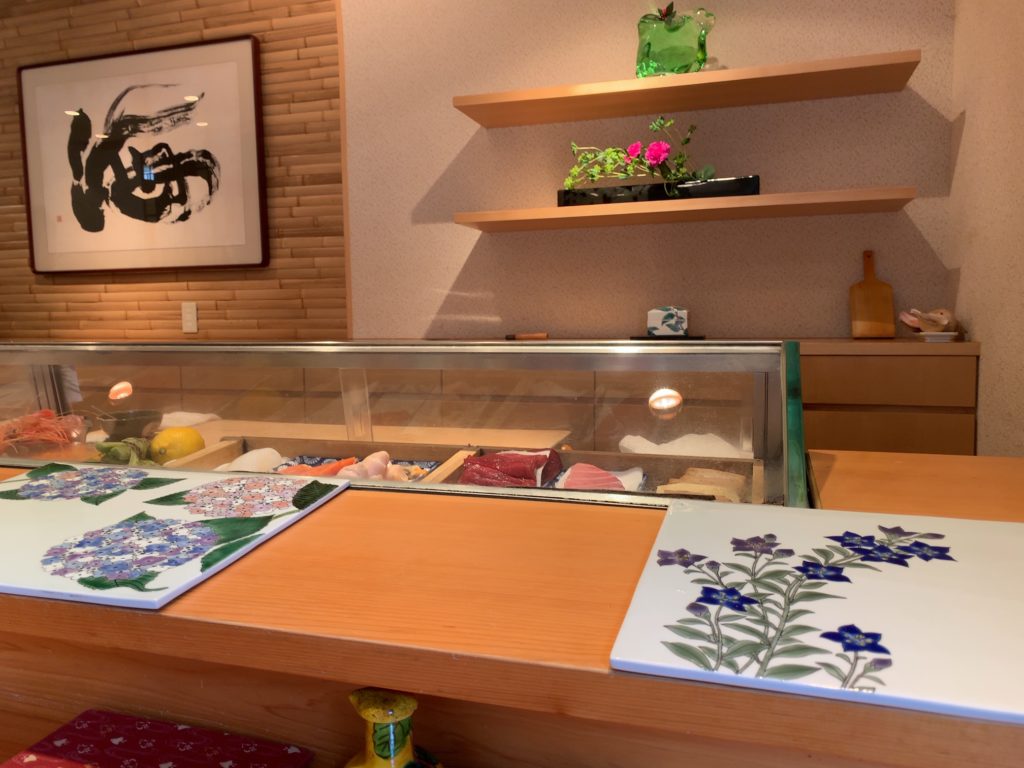 店内は10席ほどの桧のカウンター席と、小上がり席があります。ひとりでしたのでカウンター席に案内されます。落ち着いた店内です。お皿が美しいのが印象的です。