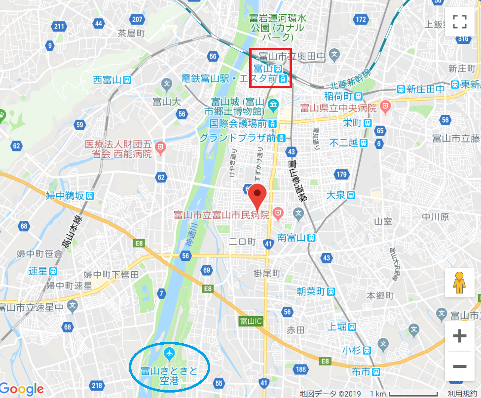 ちょうど富山駅(下の地図赤四角)と富山きときと空港(下の地図青丸)の間にあります。タクシーなら富山駅からも富山きときと空港からも10分ちょっとで到着できそうです。