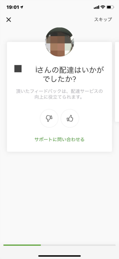 受け取りが完了すると、アプリで配達パートナー、料理、お店の評価をすることができます。スキップもできますし、何かある場合はメモを追加することもできます。特に問題なければGOODを押してあげましょう。相互評価がUberのシステムの肝ですので!