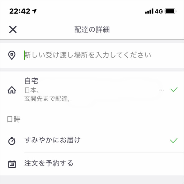 下のスクショのように届けてほしい場所を入力します。住所でもOKですし、施設名を入れると候補が表示されます