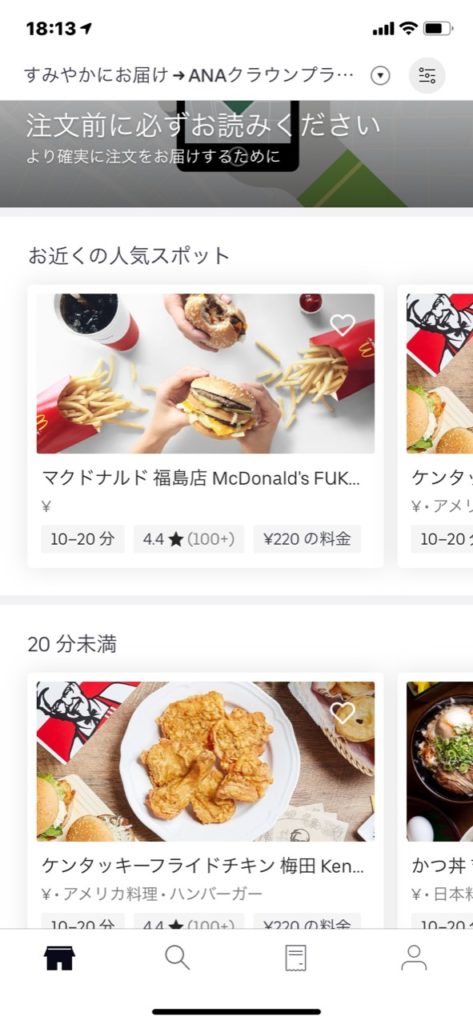 下部メニューアイコンの左端にある家型アイコンをタップすると、近隣のUber Eats 登録店舗が表示されます。下にスクロールしていくと、
