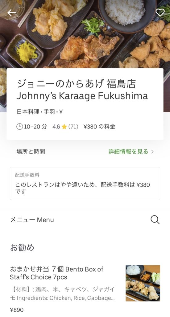 店舗一覧が表示される画面では、評価、配達手数料、配達に要する時間、メニューを確認することが出来ます。