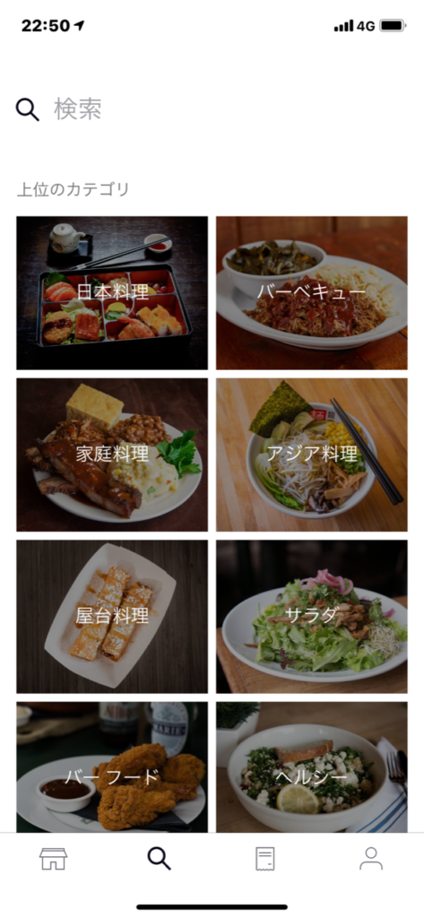 アプリ画面下の「虫眼鏡マーク」をタップすると、「ハンバーガー」「丼もの」「洋食」「ピザ」などなどジャンル別で探せる画面になります。