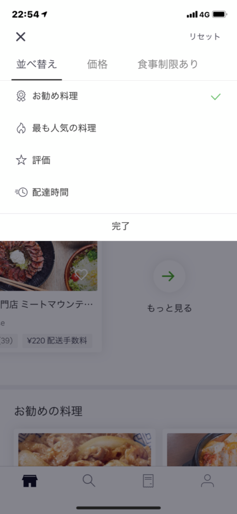 上部の「フィルター」をタップすると、人気順、評価順、配達時間順、料金や配達料の安い順などの並べ替えが可能です。