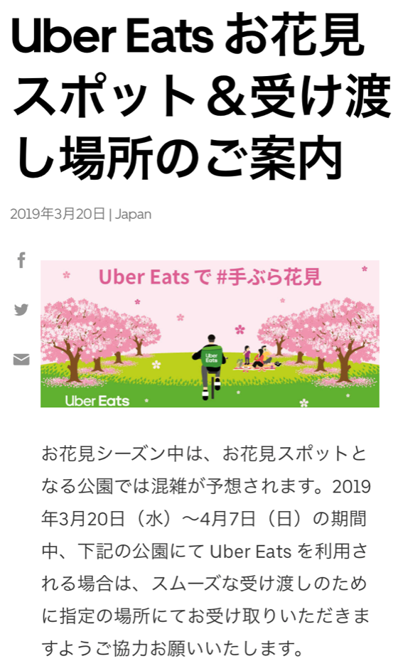 そのサービスをフードデリバリー(出前)に落とし込んだのが「Uber Eats」です。Uberの配車システムの技術を活用することで、自宅や職場だけでなく、花見の最中など出先でも指定した場所にスマホアプリひとつで20分もすれば出来立ての料理が配達されます。