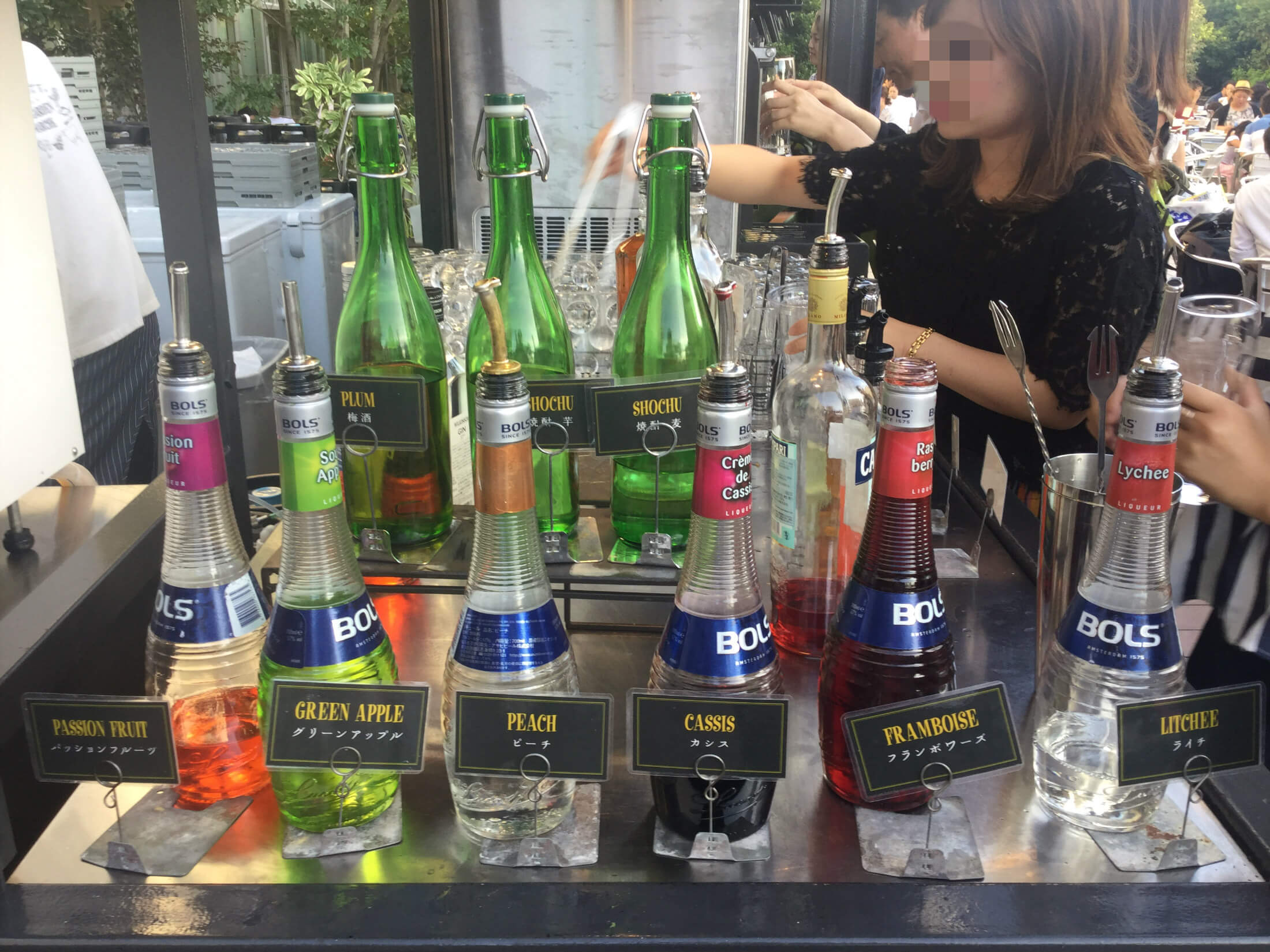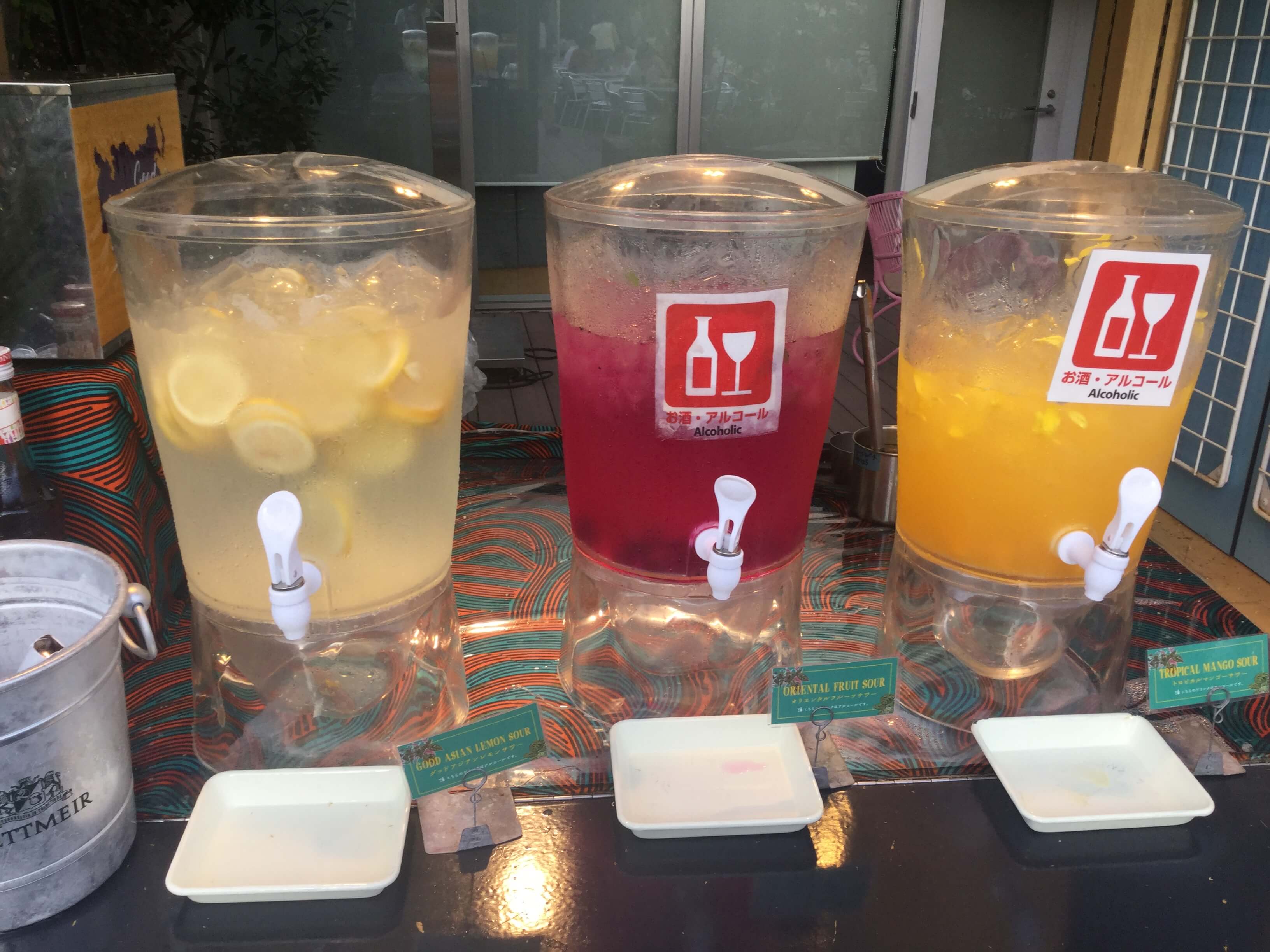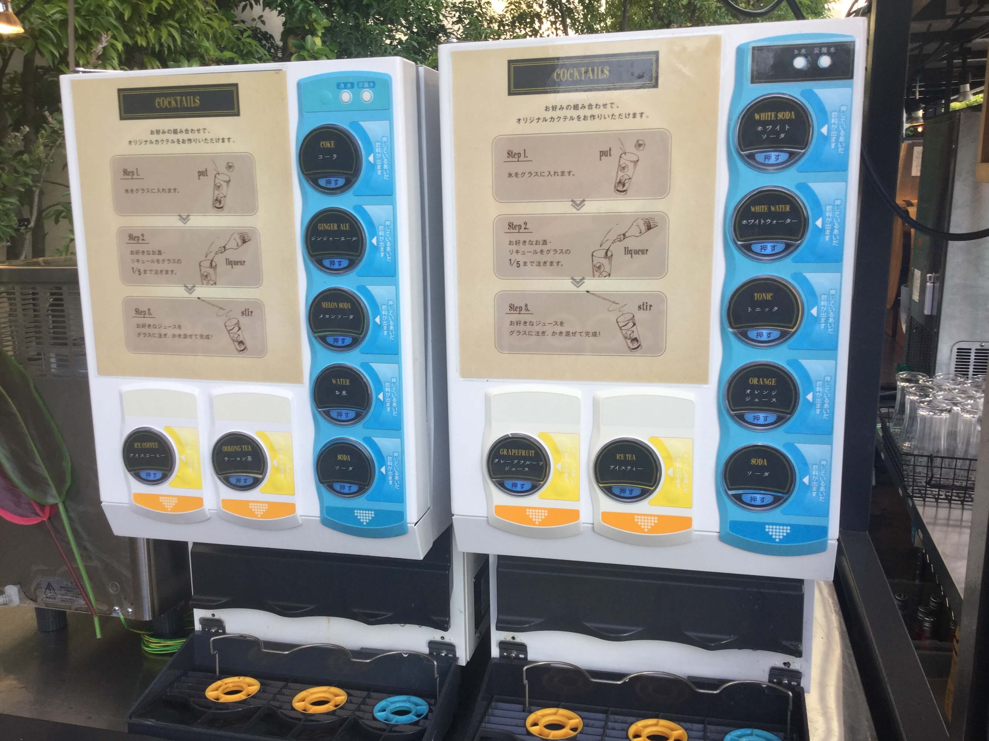 このようにずらっとリキュール、焼酎、梅酒などが並んでいます。自分で割って作ります。以下のソフトドリンクのサーバー内にトニックウォーターやソーダも準備されています。
