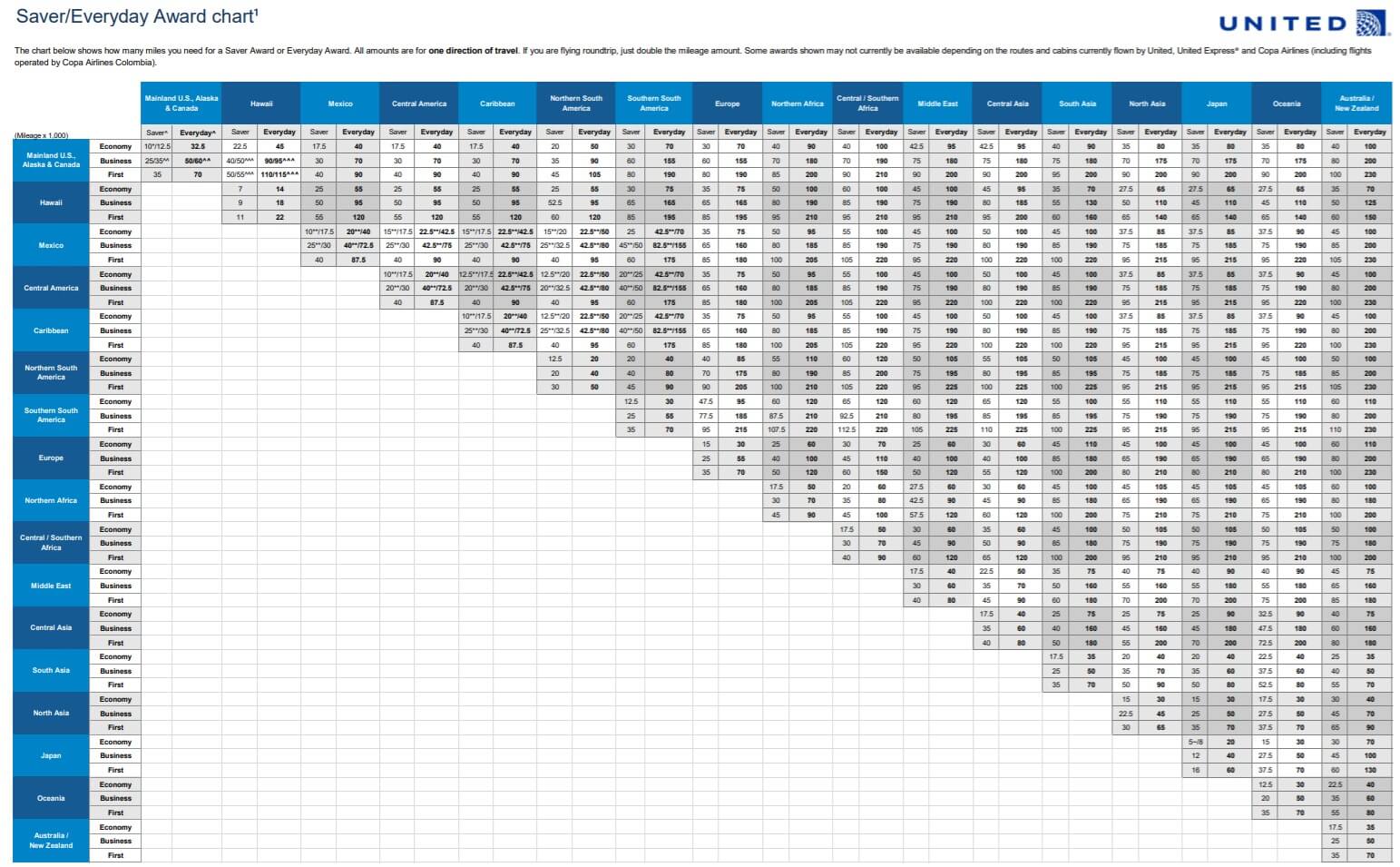 ユナイテッド航空海外特典航空券発券時には以下に説明していた必要マイル数チャートというものがありました。ユナイテッド航空海外特典航空券の交換ではセーバー特典とスタンダード特典と言う2種類の特典によって必要マイル数が変わります。セーバー特典の方がより少ないマイル数で特典航空券を交換することができますが日付やシート数が限定されています。細かいですが以下のチャートのようになっています。