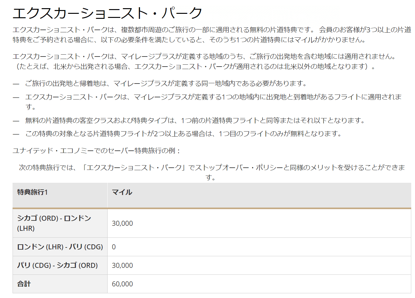 ユナイテッド航空特典航空券をお得に発券するコツは以下の「エクスカーショニストパーク」というシステムを上手く使うことのようです。簡単に言うと「複数都市を周遊する際に一部の特典が無料になる」システムのようです。