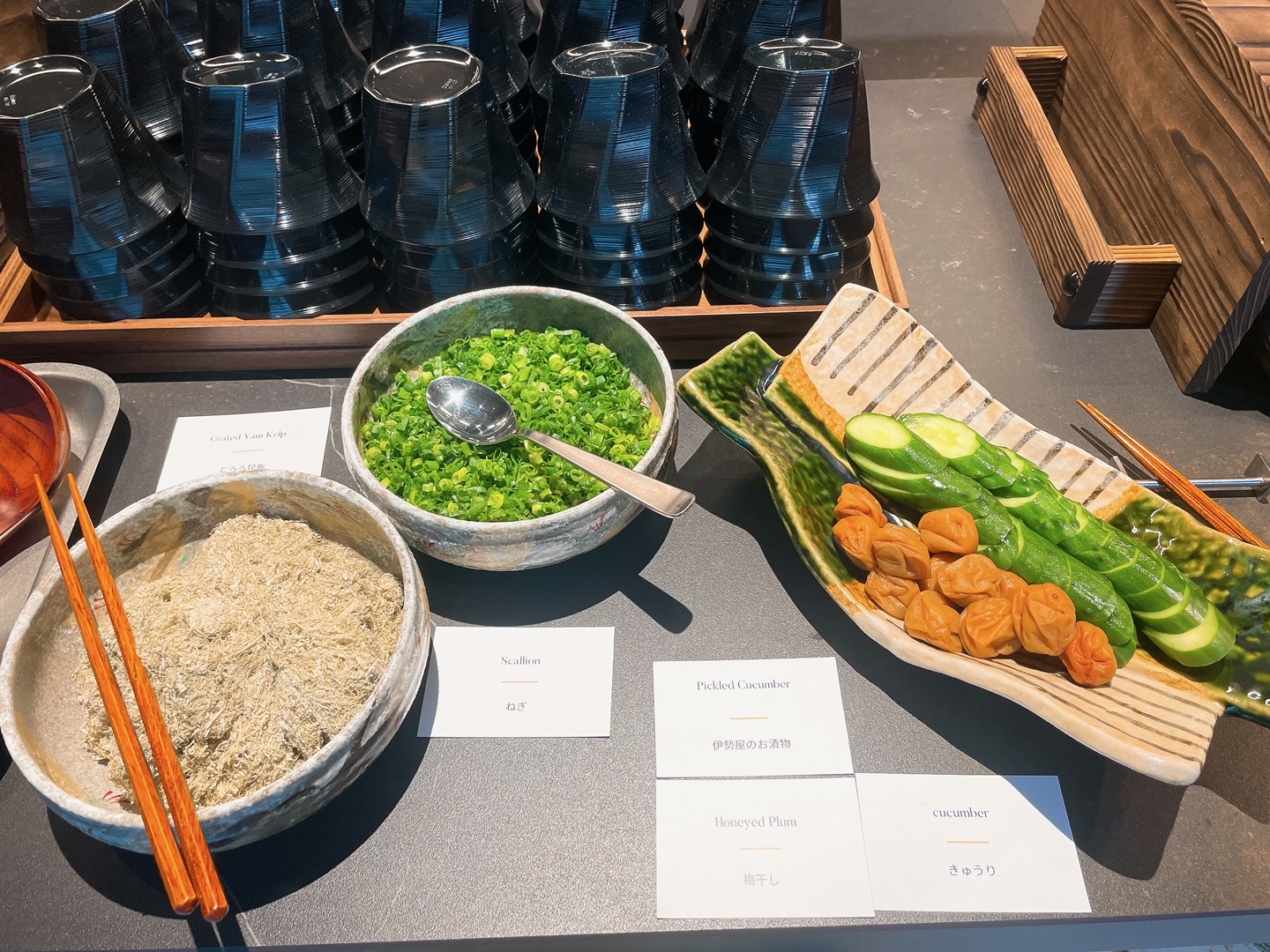 伊勢屋のお漬物(きゅうり、梅干し)、ねぎ、とろろ昆布