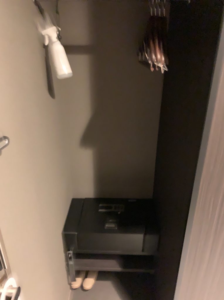 入ってすぐ左手にはクローゼットスペースがあります。暗くてぶれていますが、セーフティボックス、スリッパ、ハンガー、消臭スプレーが置かれています。