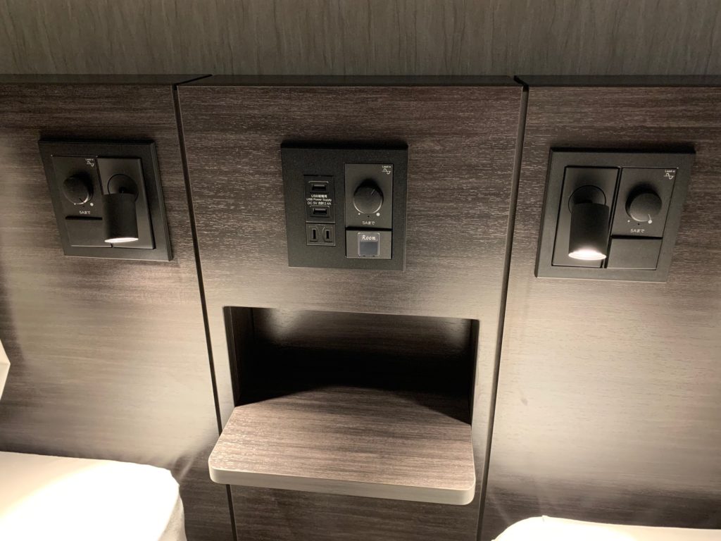 枕元には照明のスイッチと、コンセント1口、USBコンセント2口があります