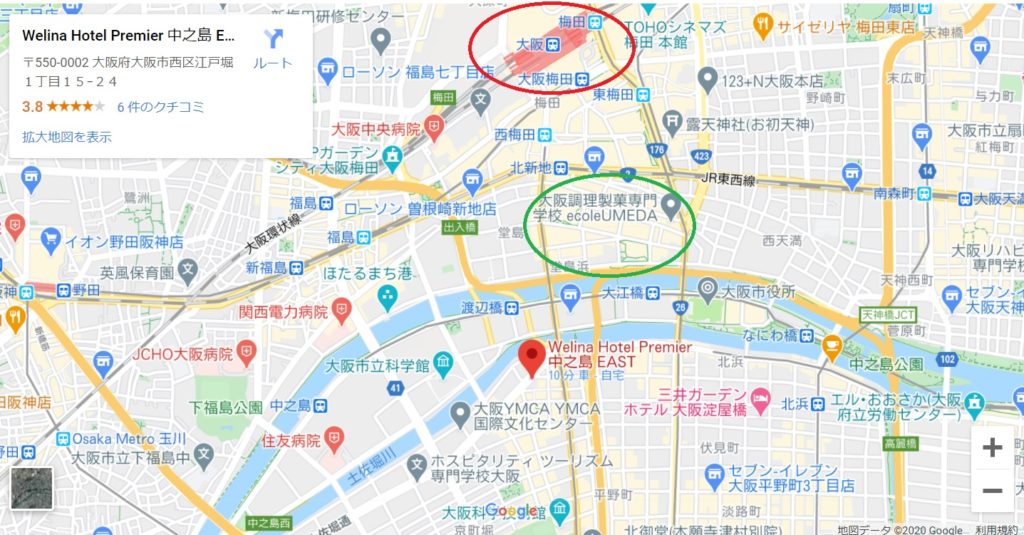 地図を見てみましょう!下の地図赤丸がJR大阪駅、各線梅田駅となります。緑丸が北新地です。