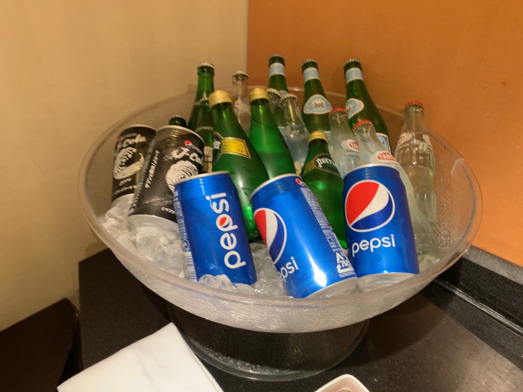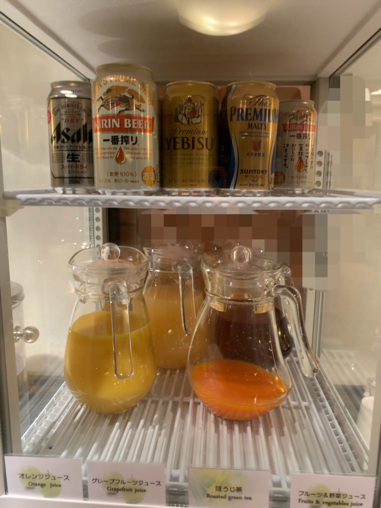 冷蔵ケースの中にはビール4種類(サントリープレミアムモルツ、エビス、キリン一番搾り、アサヒスーパードライ)、ソフトドリンク4種類(オレンジジュース、グレープフルーツジュース、フルーツ&野菜ジュース、ほうじ茶)が入っています
