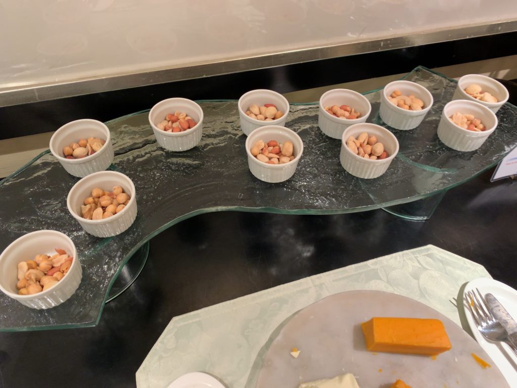 席に着くとおつまみ4種類が提供されます。こちらはスタッフの方が持って来てくださいます。ドリンクや他のフードはセルフサービスです。