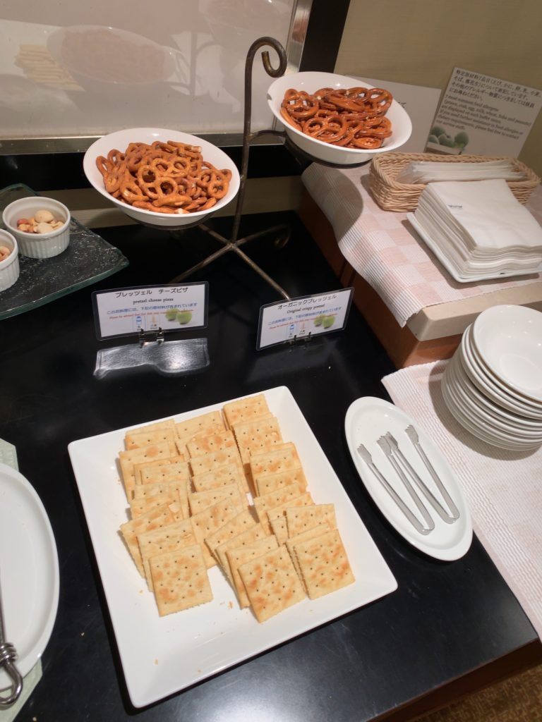 プレッツェル2種類(オーガニックプレッツェル、プレッツェルチーズピザ)、クラッカー